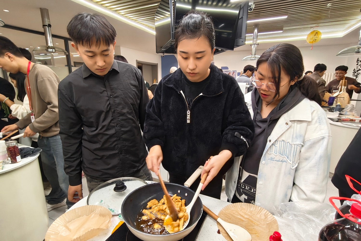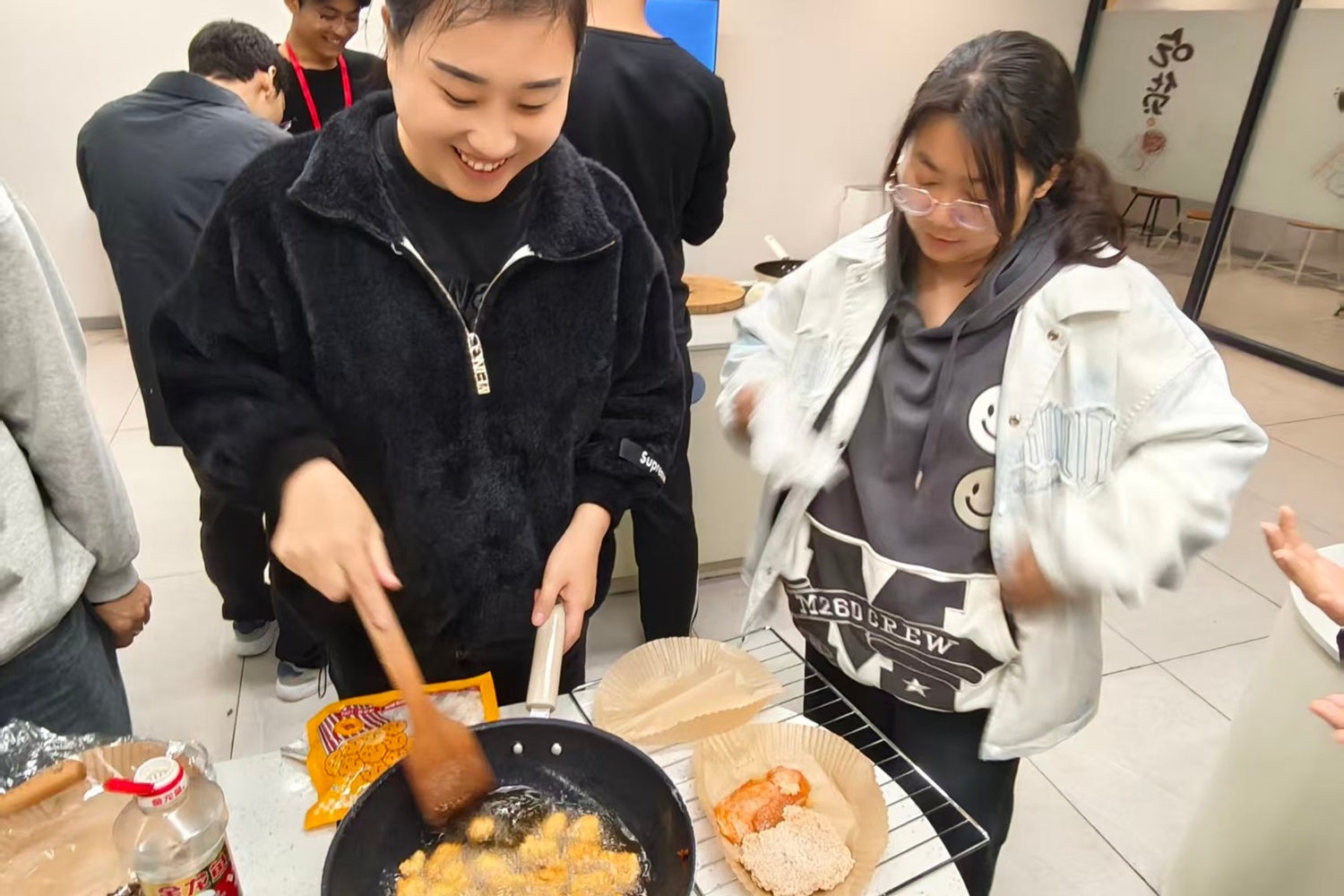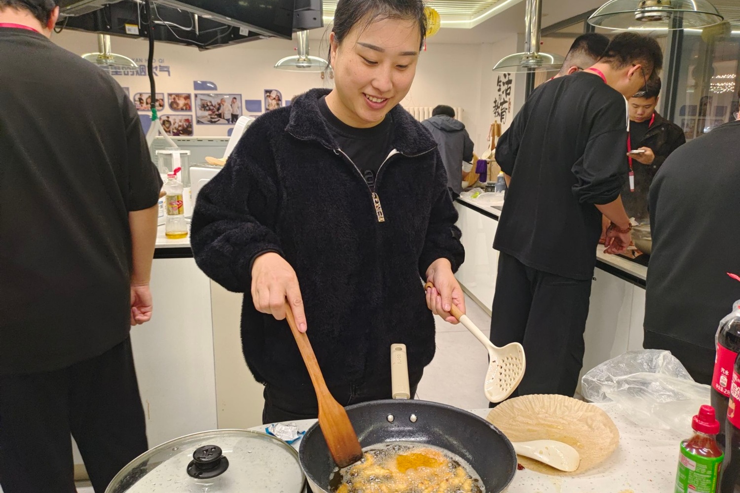 砂锅里的可乐咕嘟作响,姜片在琥珀色的液体里慢慢舒展,贾老师手把手教大家掌握火候:“可乐熬到冒泡收浓,姜的辛暖才会融进去,不呛还暖胃。”同学们围着灶台探头看,有人忍不住偷尝一口热汤,眯着眼笑:“像把冬天的阳光喝进嘴里!”另一边的炸鸡区更热闹。炸鸡下锅时“滋啦”一声炸开香气,贾老师帮着调整油温,怕大家被油溅到。等油锅里的油温慢慢升起来,有同学怕油溅到,手缩在半空不敢下肉。贾老师拿起一双长筷,夹起一块鸡排示范:“你看,热油溅起像生活里突然冒出来的小麻烦,躲是躲不过的,但只要找对角度、稳一点,就能避开。”她将鸡腿轻轻滑入油锅,“滋啦”一声响后,油花反而乖乖收了回去,“很多时候,别怕‘开始’,稳住节奏就赢了一半。”炸好的鸡腿外皮脆得咬开有响声,内里的肉却嫩得能流出汁,刚出锅就被抢着装进餐盘。炸好的鸡腿外皮脆得咬开有响声,内里的肉却嫩得能流出汁,刚出锅就被抢着装进餐盘。韩心语捧着自己炸的鸡排,咬了一口笑:“原来等油温够、慢慢炸,比急着出锅好吃太多!”贾老师点点头:“这等待的时间可不是浪费,就像你们平时积累知识,看似‘慢’,其实是在让‘美味’沉淀,到时候自然能尝到甜头。”旁边的薯条也不示弱,土豆条炸得外酥里糯,撒上细盐,蘸一口番茄酱,和炸鸡配在一起,满是让人满足的烟火气。