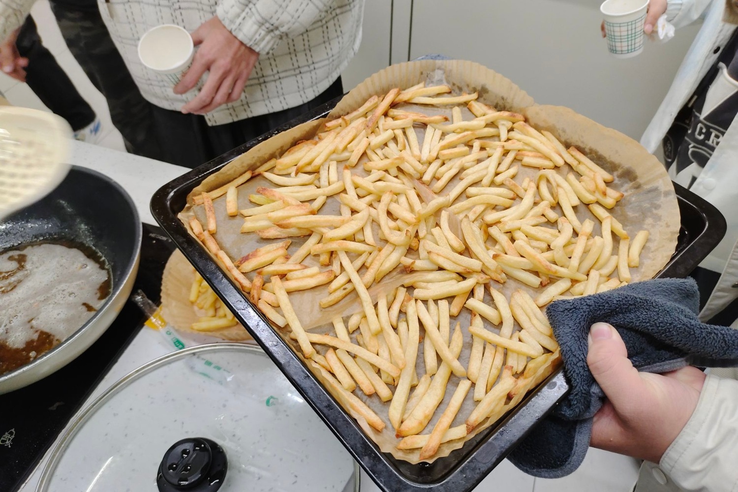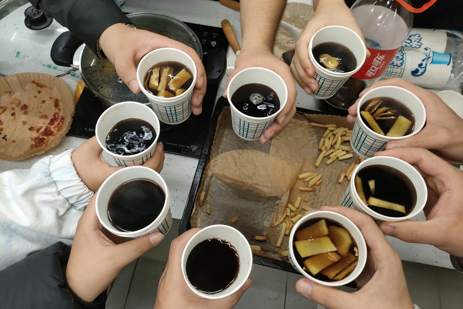 同学们捧着热乎的姜丝可乐杯,手里拿着炸鸡薯条,围坐在一起。有人说:“没想到姜丝可乐和炸鸡这么搭,暖的甜的脆的混在一起,像穿越到了不同的美食时空!”贾老师看着大家吃得满脸笑意,也拿起一根薯条:“美食最能拉近心的距离,咱们这既是解馋,也是给忙碌的学习添点暖。”