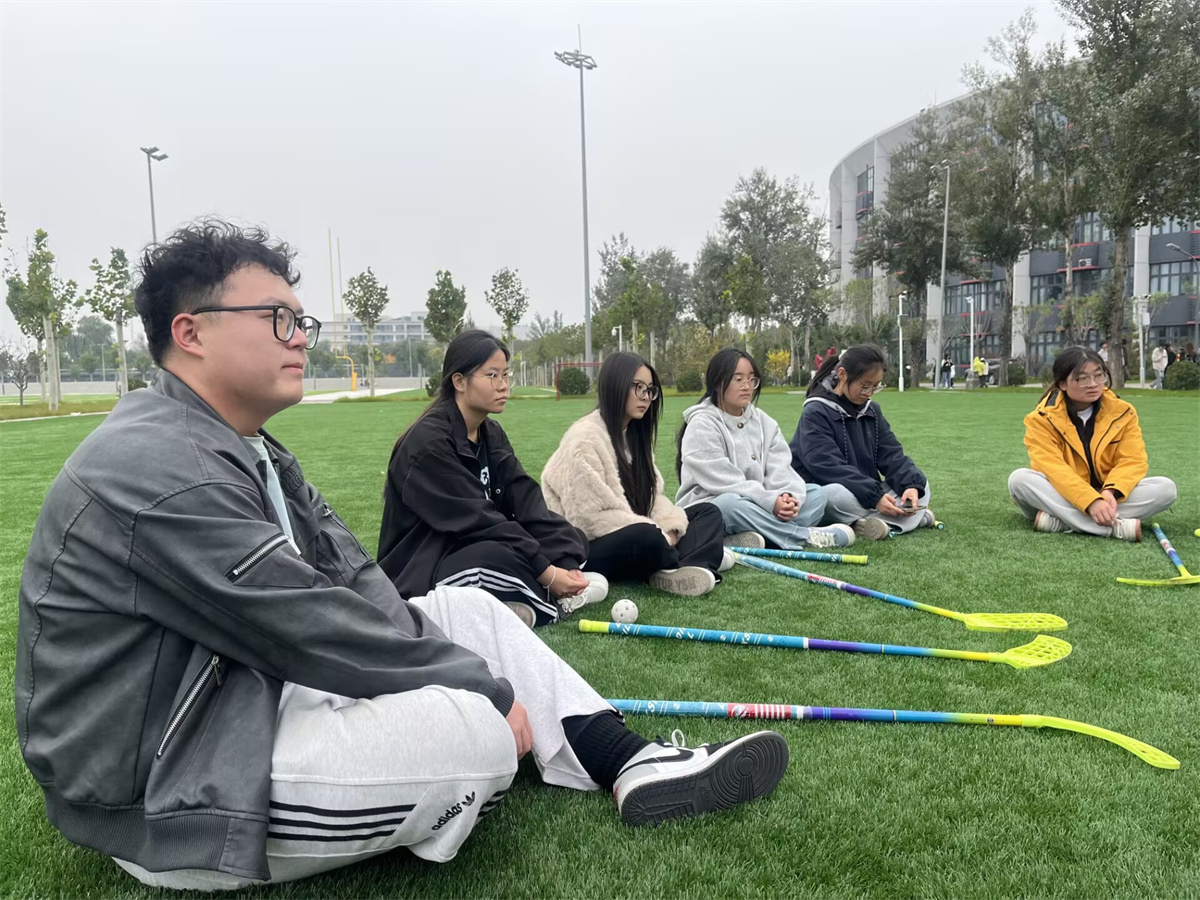 薛老师细致讲解手胶位置、持杆方式等关键要点,传授运球、传球技巧,着重强调击球规则——杆头不能超过杆尾,还亲自演示传球、击球、接球、停球的规范动作。学生们认真模仿练习,在缓慢拨球时,仔细感受杆与球的接触,体会力度的细微变化,于慢节奏里逐渐凝聚注意力,初步培养控球感觉。