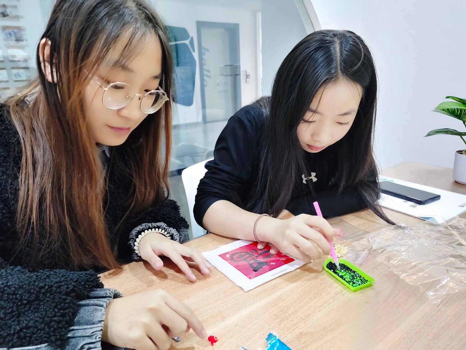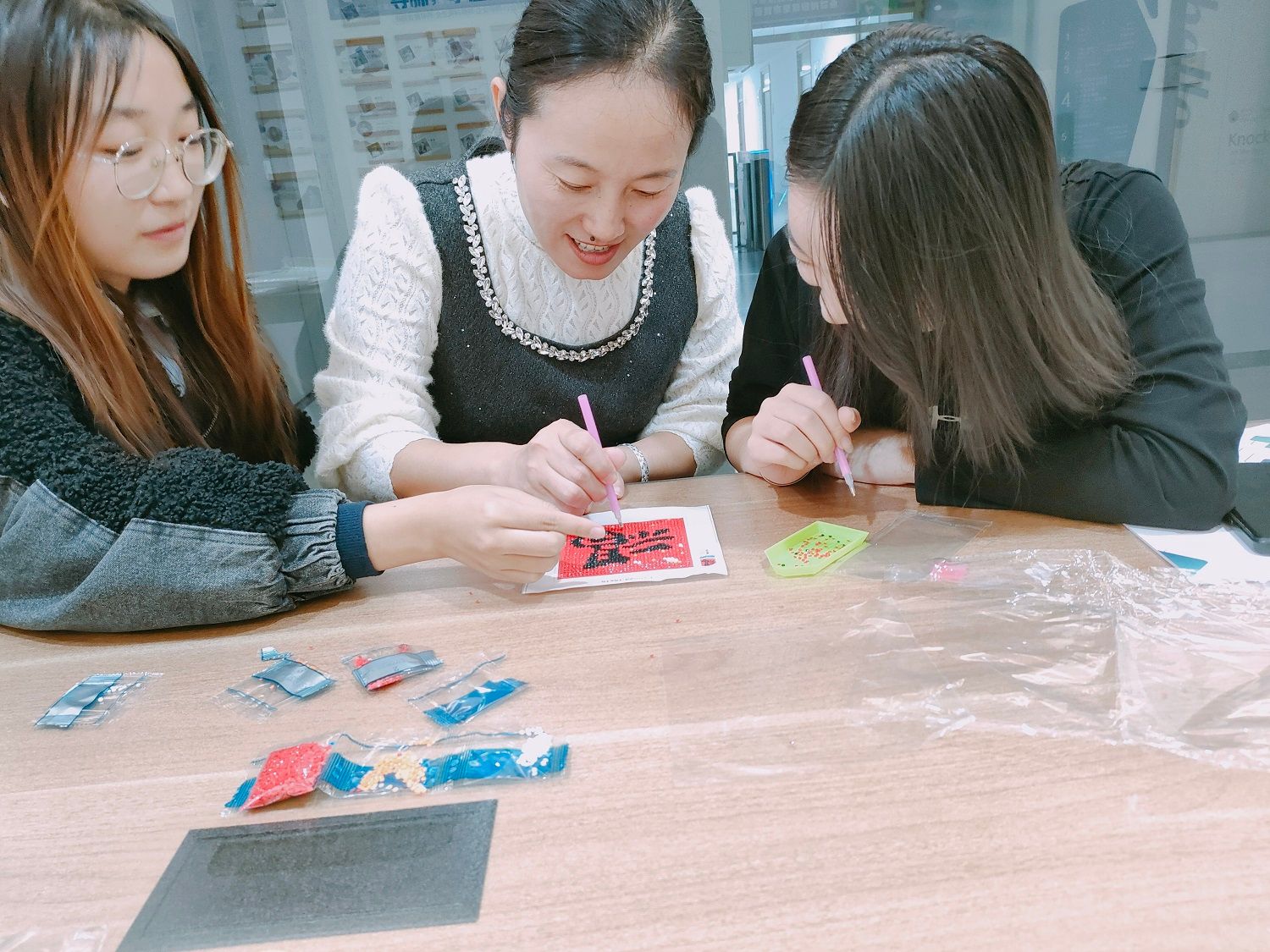 随后,师生们便全身心投入到钻石画制作中。老师耐心地向同学们讲解粘贴技巧,从如何精准定位钻石位置,到怎样避免钻石脱落,每一个细节都细致指导。同学们也相互交流经验,小心翼翼地拿起小镊子,将一颗颗闪亮的钻石粘贴在画布上,原本空白的画布,在师生的共同努力下,逐渐显现出“福”字的饱满轮廓和“前程似锦”的灵动字体,旁边的金色元宝也为作品增添了几分喜庆气息。