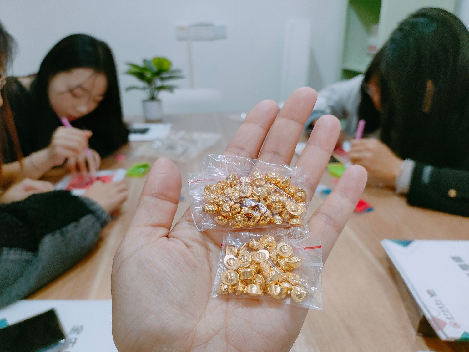 活动伊始,老师为同学们分发了手工材料包,里面不仅有制作“福”字和“前程似锦”字样钻石画的材料,还有几颗精致的金色元宝摆件。看到金灿灿的元宝,有同学笑着说:“最近听说黄金价格一直居高不下,要是这些元宝是真的,那可太珍贵啦!”伦老师也加入讨论,用轻松幽默的话语活跃氛围。