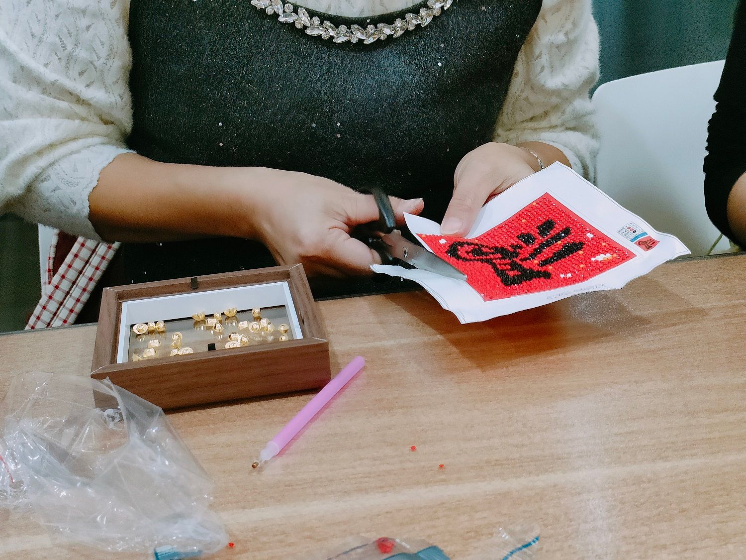 “老师,您看我这颗‘福’字的钻石贴得正不正?”“这个金色元宝要是真的就好啦,现在黄金价格这么高呢!”