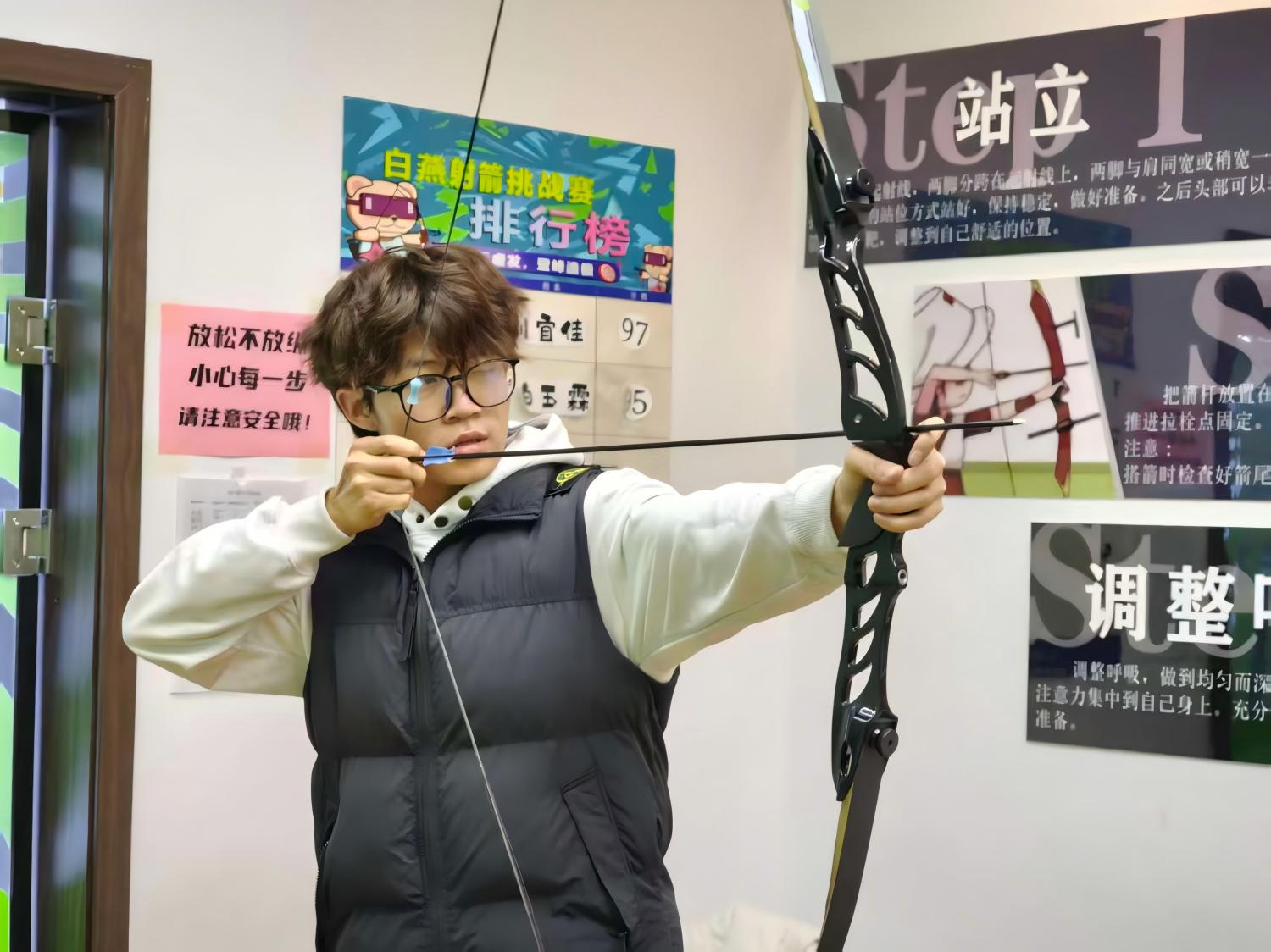 就拿这位同学来说,他特别社恐,然而,在射箭活动中,我看到了一个截然不同的他——他能够放下内心的戒备,与他人进行正常交流。而且,他还愿意展现自己的长处,比如射箭时的力量感和精准的瞄准技巧。