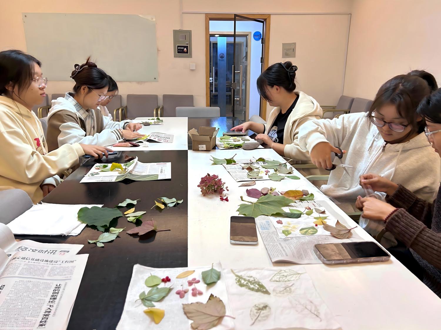 在植物拓染的过程中,大家共同探索,学生们分享着自己对于植物的认识和拓染的小技巧,发挥自己的奇思妙想,挑选出最心仪的植物,寻找那些形状各异、色彩斑斓的植物叶片,将一片片植物精心排列在布料上,用小锤子轻轻敲打,让植物的汁液慢慢渗透到布料中,留下独一无二的印记,变成了一件件充满创意和艺术感的作品,每一件都承载着师生间共同的美好回忆。