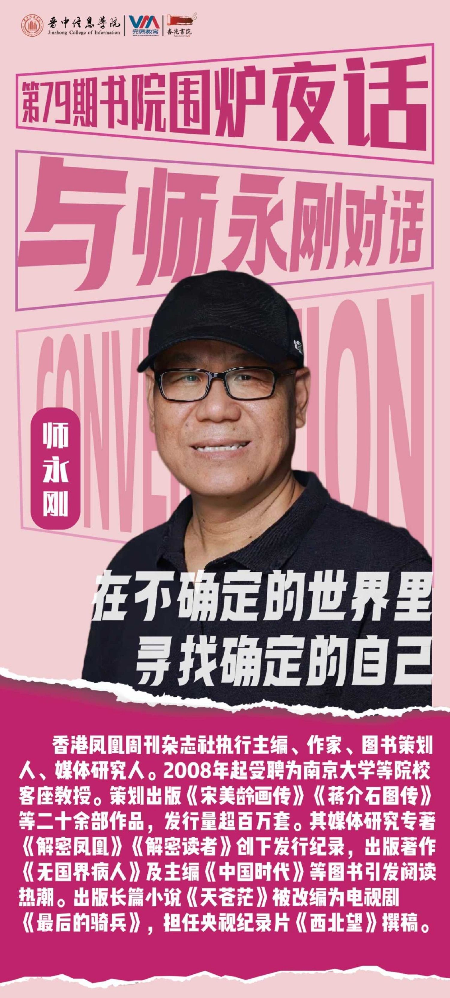 嘉宾介绍:师永刚,香港凤凰周刊杂志社执行主编,作家、图书策划人、媒体研究人。2008年起受聘为南京大学等院校客座教授,策划出版《宋美龄画传》《蒋介石图传》等二十余部作品,发行量超百万套。其媒体研究专著《解密凤凰》《解密读者》创下发行纪录,出版著作《无国界病人》及主编《中国时代》等图书引发阅读热潮;出版长篇小说《天苍茫》被改编为电视剧《最后的骑兵》,还担任央视纪录片《西北望》撰稿,2015年参与领投乐钱农业项目,研究涵盖《读者》《时代》等刊物,策划出版多部畅销书,跨界领域成果斐然、见解独到。