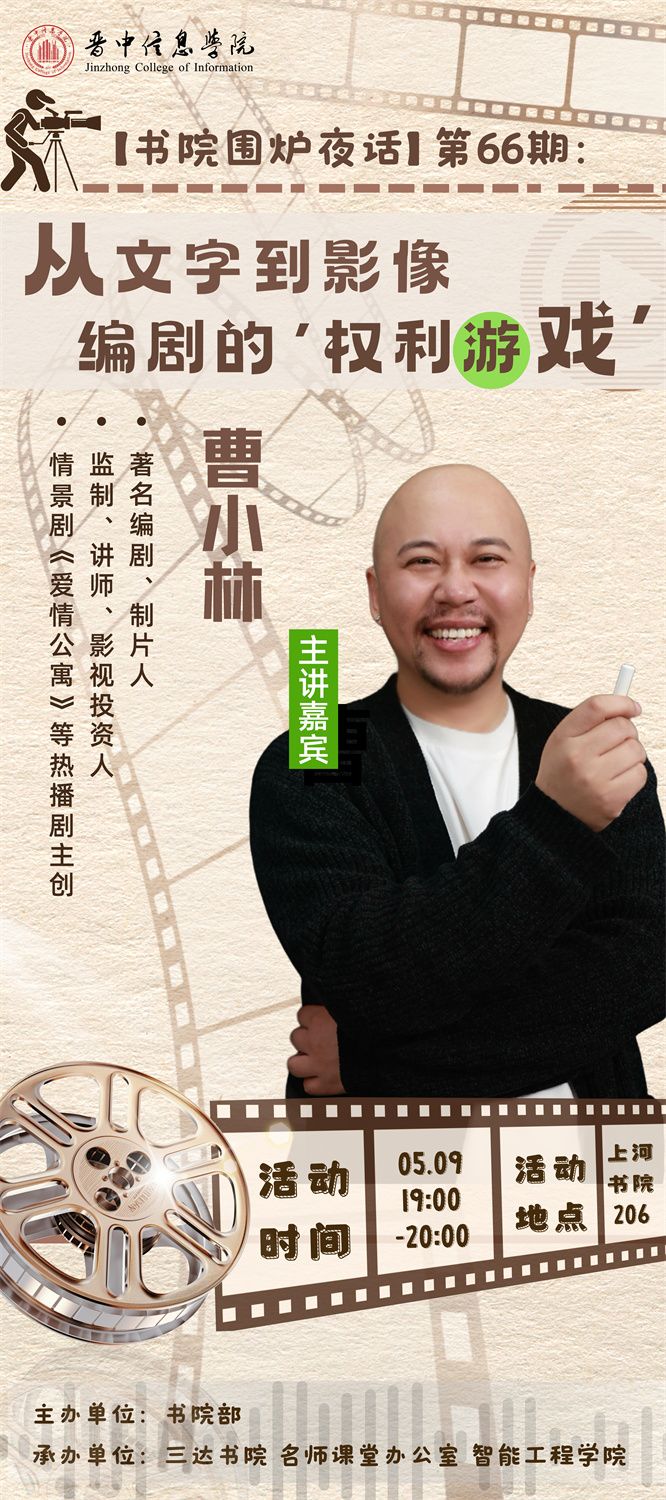 由书院部主办,三达书院、名师课堂、智能工程学院承办的第66期“书院围炉夜话”将于5月9日(周五)19:00-20:00,在上河书院206竹林·围炉夜话与大家见面,本次做客的嘉宾是著名编剧、制片人曹小林。