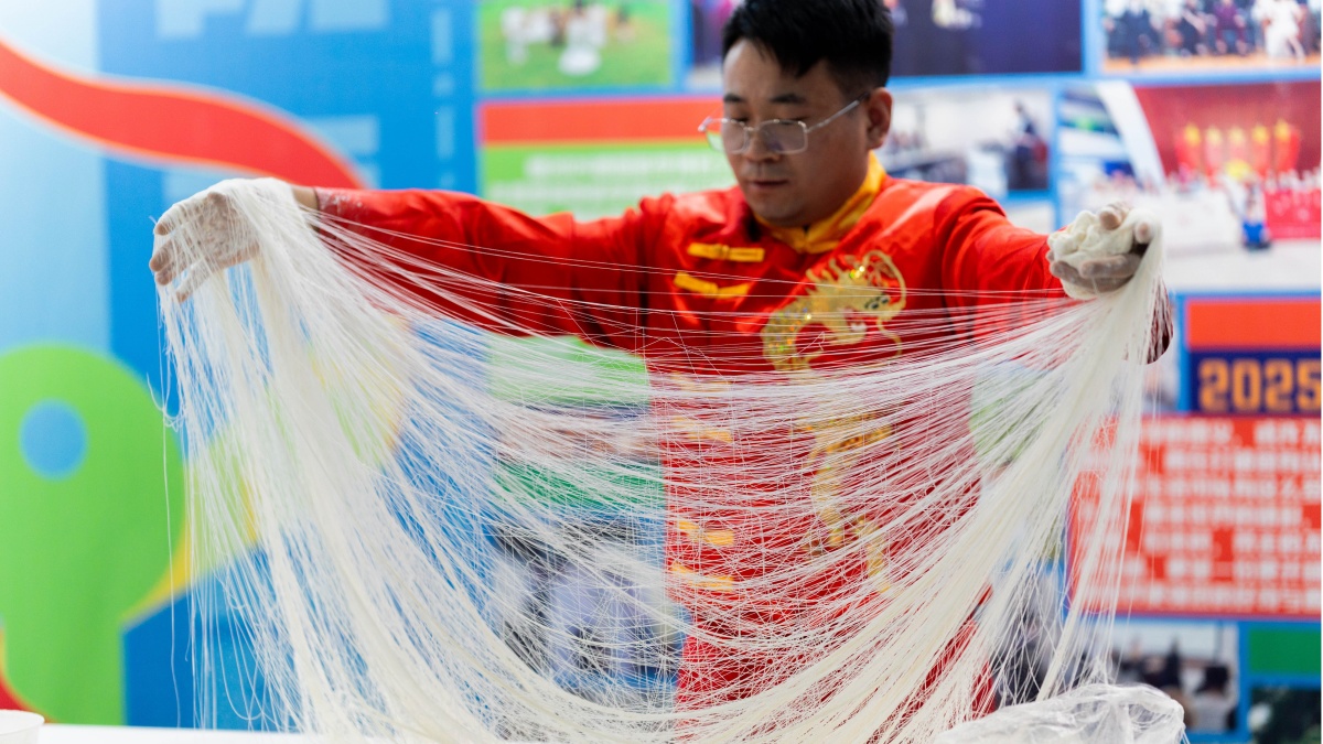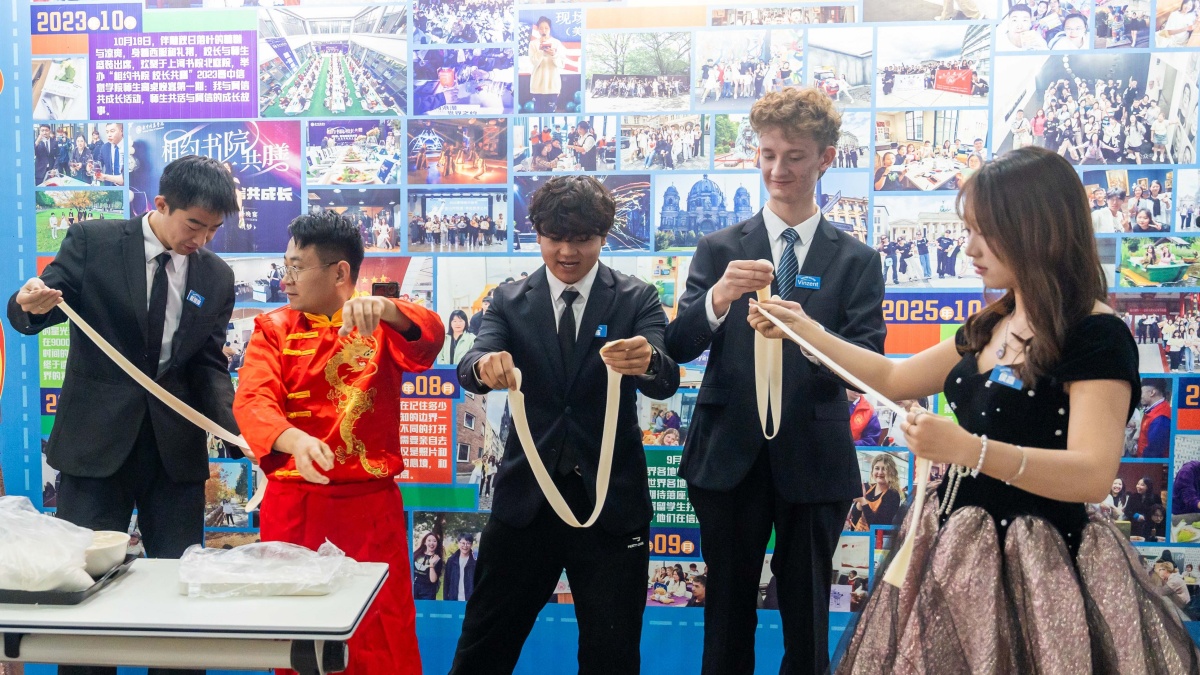 最令人惊叹的连接,莫过于“面食之乡”的烟火气。国家特一级面点师问烨挺师傅带来了一场精彩的非遗技艺展示,头顶刀削面、龙须面扯制、面团吹气球等绝活让中外师生赞叹不已;面团在指尖流转变幻,精湛技艺引得全场赞叹。表演间隙,师生们踊跃上前互动体验,在师傅的悉心指导下亲手扯面,指尖触感与技艺传承相融,沉浸式感受非遗面食的匠心与温度。这场兼具观赏性与参与感的表演,让山西面食文化得到生动传播,更让大家近距离触摸文化肌理,尽显“世界面食在中国,中国面食在山西”的地域文化底蕴。