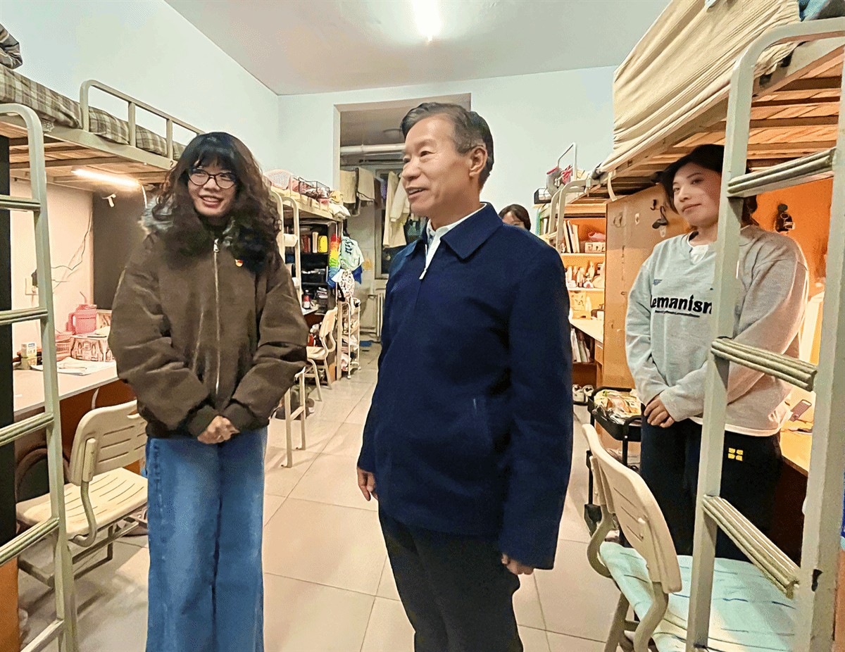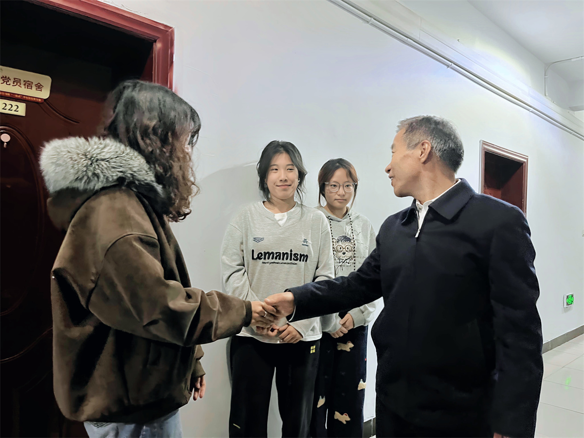 “宿舍挂牌·党员先锋表率”将现场延伸至学生生活的核心场域——宿舍。张书记、杨院长、徐部长走进宿舍,亲切询问同学们的学习生活情况。随后,庄重的“党员先锋宿舍”挂牌仪式在代表宿舍举行。张存伟书记亲自将鲜亮的“党员宿舍”标牌授予宿舍成员,悬挂于门楣之上。