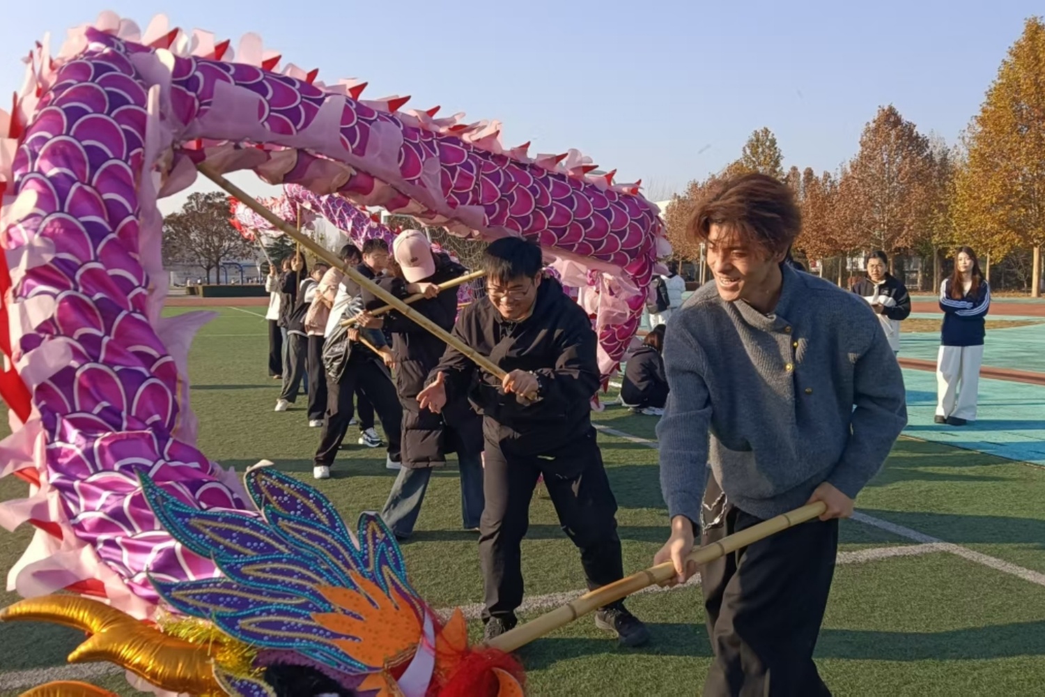 11月14日15时,舞龙民俗社区体验活动于第二运动场顺利开展。本次活动由龙腾狮跃文化工作室贾子杰同学担任指导。在教学环节,贾子杰从基础站姿的核心作用切入,深入浅出地对“游龙”“盘龙”等经典招式的动作要领进行讲解,重点剖析了整套动作的协调性与连贯性。在实践环节,现场同学通过分组协作与反复练习,不断攻克配合难点,最终成功实现了彩龙的流畅舞动,现场气氛热烈。本次活动以沉浸式体验为载体,旨在使同学们深度感知传统技艺魅力,有效推动民俗文化在校园内的活态传承。