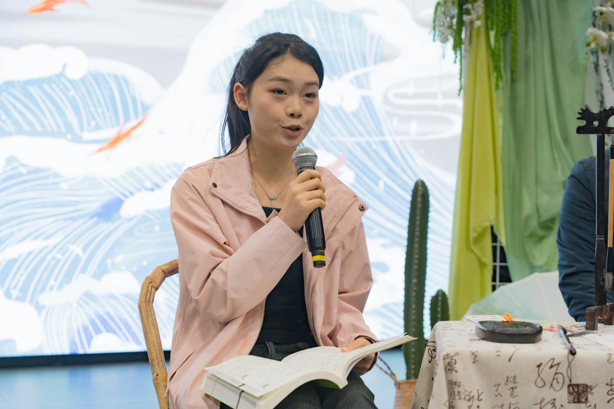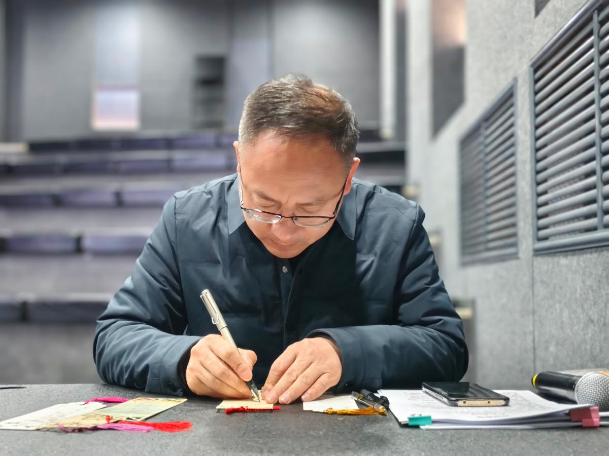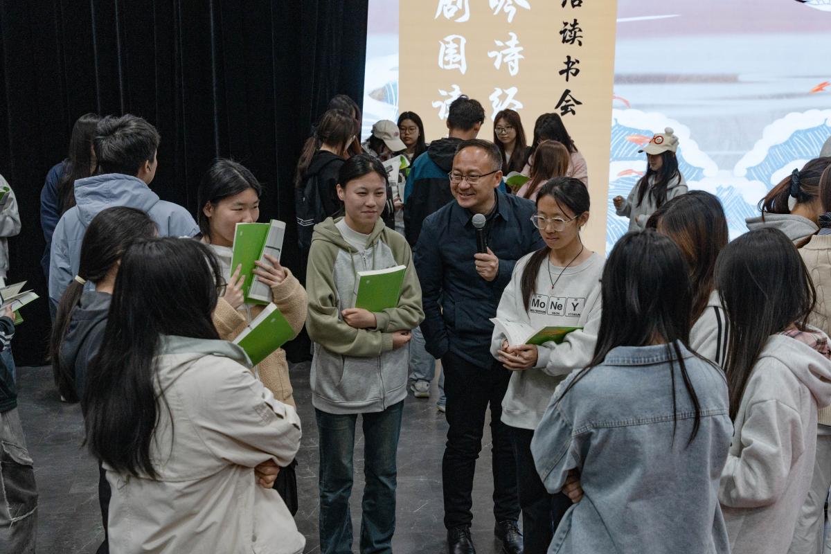 当第二小组来自信息工程学院的刘源清同学代表小组分享了自己对《子衿》诗篇的解读后,薛院长从“人的一生要为三个生而劳作”入手,告诉大家每一个人的经历都是独特的,鼓励大家要勇敢的去经历,读好自己的书,借助《诗经》这本优秀作品理解好自己的人生之路,在有限的时间内越过人生的生存、生活两个阶段,为自己的生命而劳作。活动尾声,薛院长亲笔在春日书签上为学生送上人生箴言,“自然之心,千里乐变”、“如切如磋,如琢如磨”等字句既凝结着《诗经》的智慧结晶,更承载了薛教授对青年学子的殷切期许。