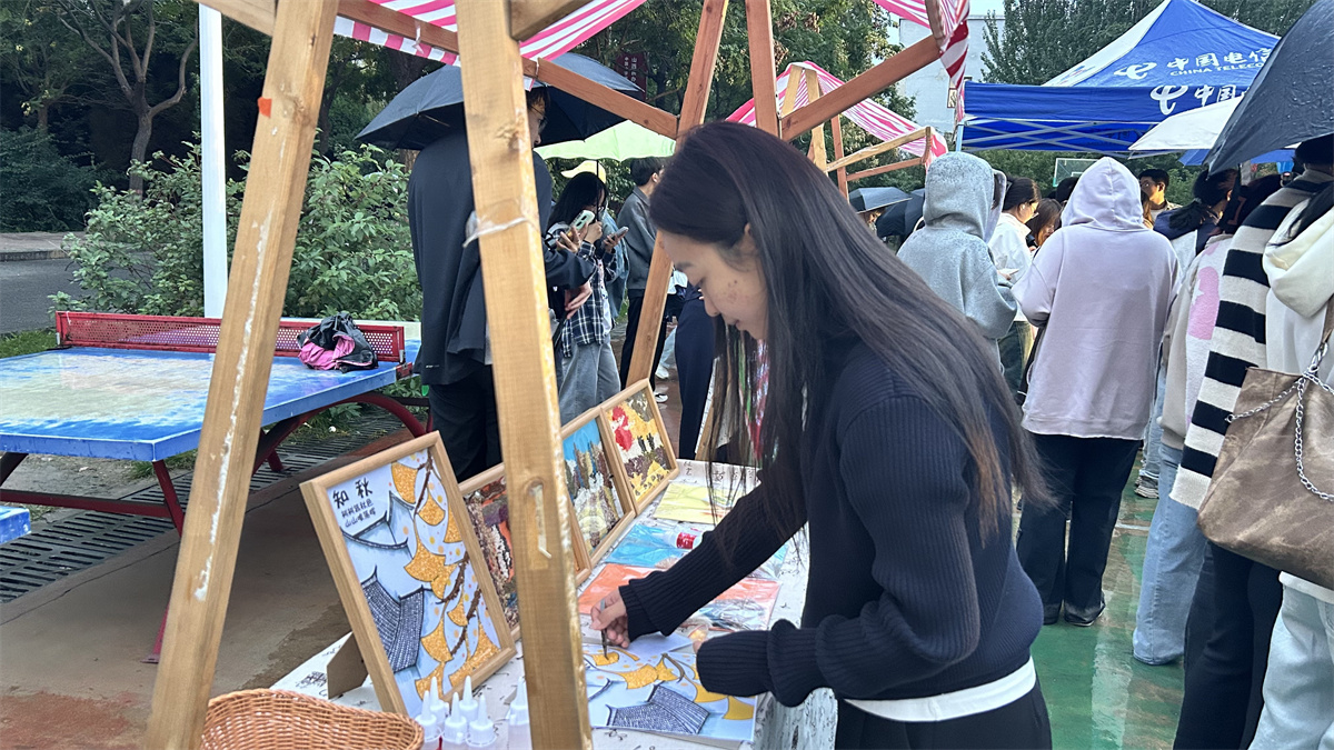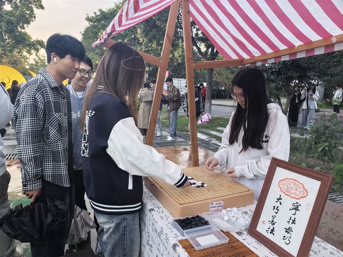 互动体验+非遗感知,一场关于山西民间艺术的文化熏陶瞬间点燃同学们的热情。五子棋对弈在落子间体验传统棋类的智慧乐趣;投壶游戏兼具趣味性与仪式感,豆子粘贴画创作更具艺术与想象力。非遗展示区则聚焦山西大院,青瓦红窗,更让同学们感受到古朴的山西文化,引得省外新生寿星连连赞叹。看似简单的投壶,却像“不听话”的小朋友,总是落在壶外,懊恼的声音混着周边同学再来一次的加油声,让活动现场充满趣味与活力。