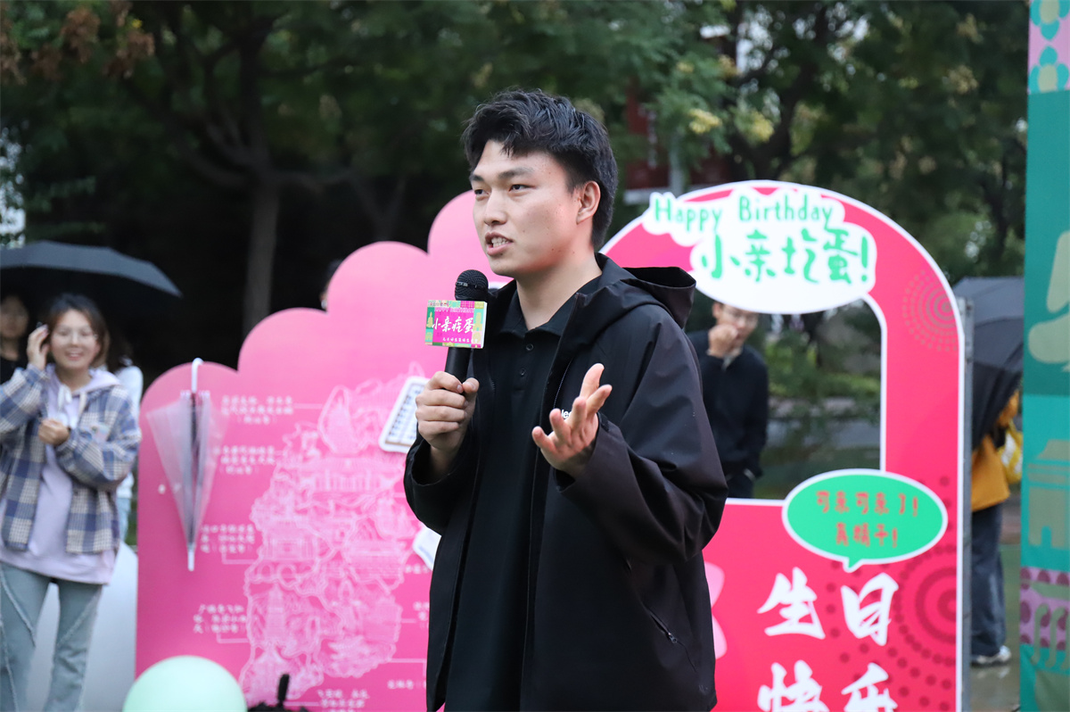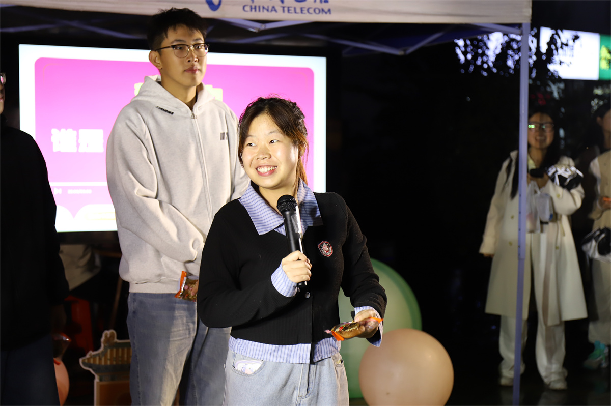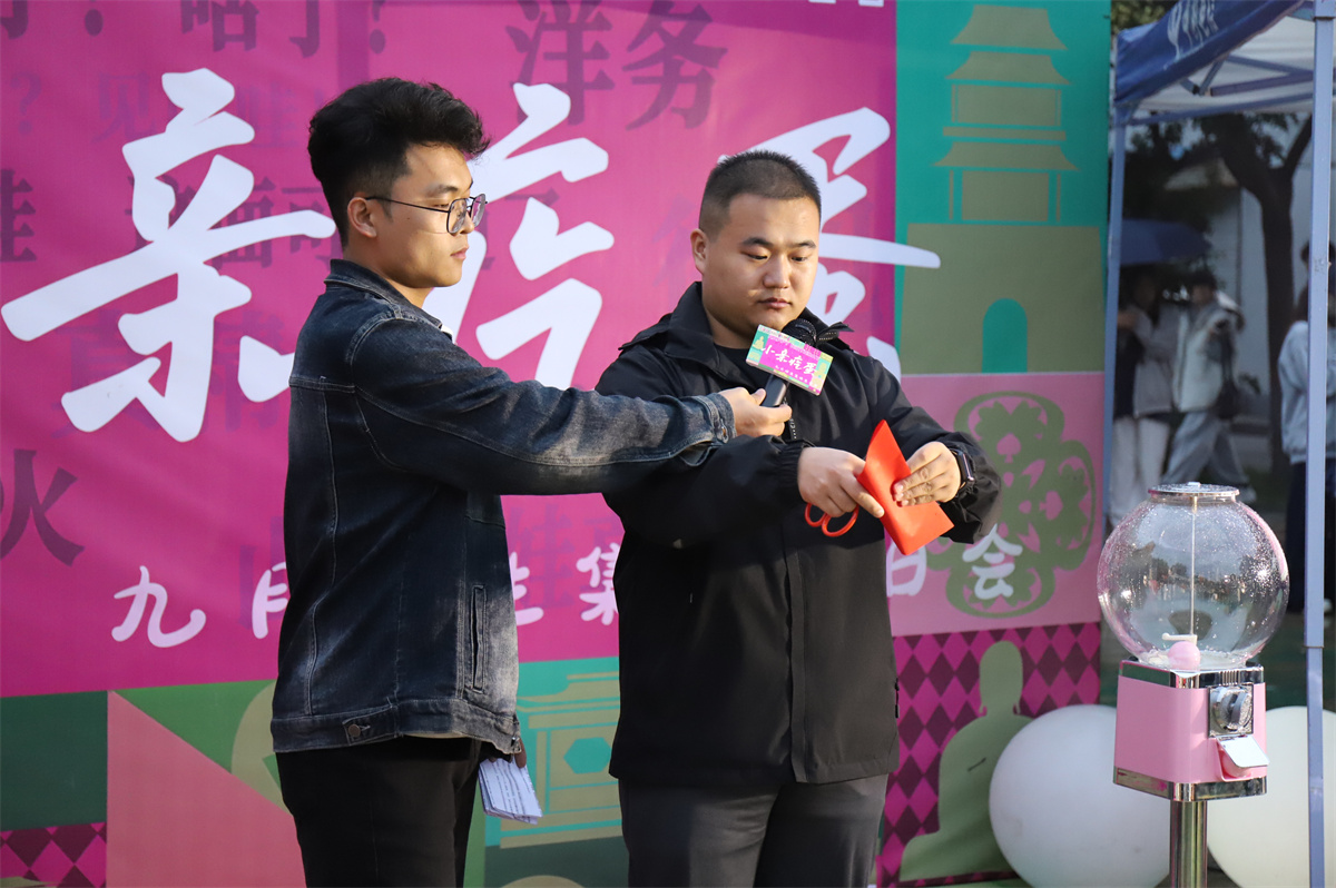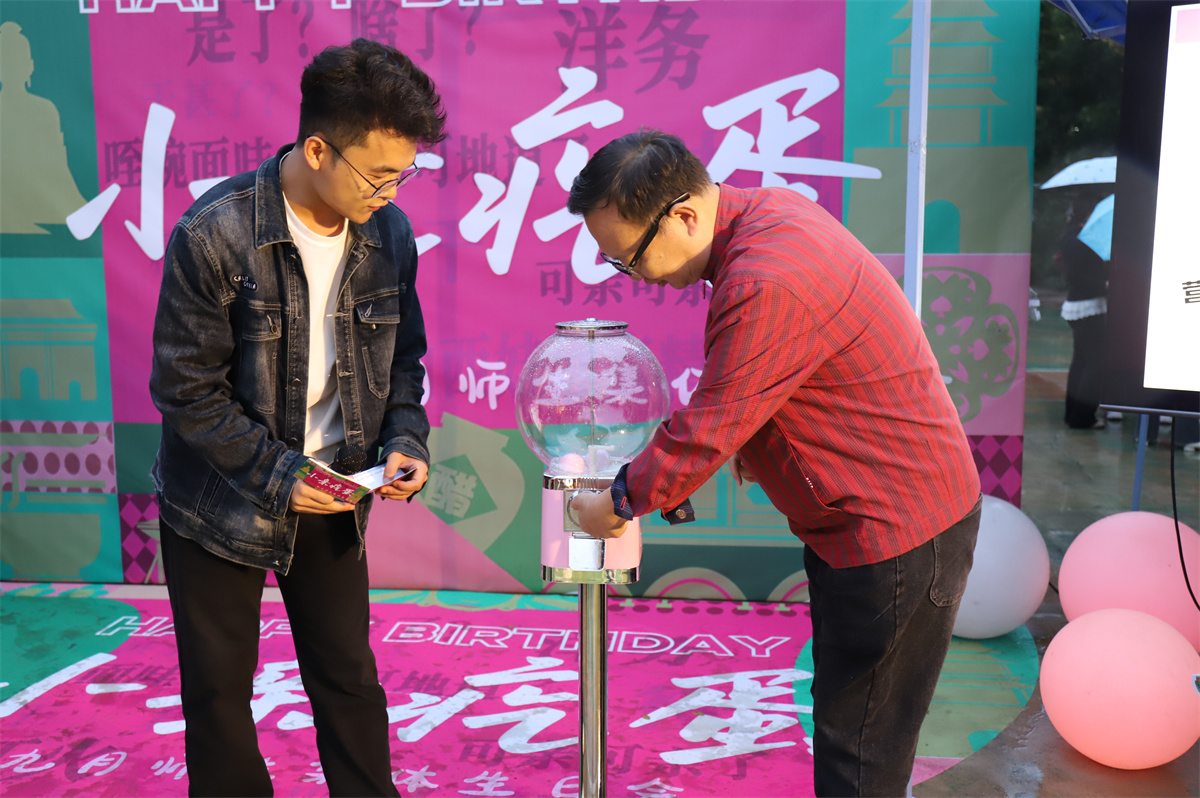 现场立着的“环节扭蛋机”一开场就成了焦点,这个充满未知感的机器内藏着九大书院的特色环节,由寿星代表扭蛋决定活动内容,这种刺激的玩法瞬间点燃了现场的气氛。首先开启的是“表达力”环节,本次邀请嘻印脱口秀项目工作坊的杨高同学,他以“各学院专业特色”为关键词,用幽默的脱口秀与新生互动。拿英语时态和山西话时态类比,让新生在欢笑中感受到阿信鼓励每一位同学自由生长的校园氛围。