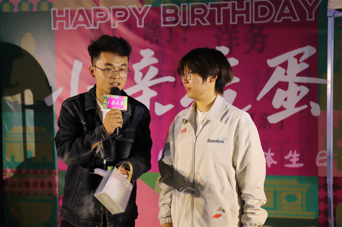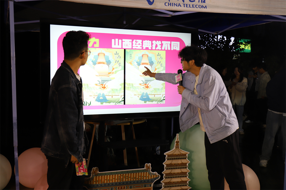 “圪蹴”“拾翻”等晋语词亮相后,省外同学瞬间开启“脑洞模式”,纷纷纳闷究竟是什么意思?看着这些犯了愁的寿星,周边围观学生里不乏一些省内“语言家”,他们化身表演者,用夸张的肢体动作给予寿星提示。而“协作力·长杆画笔写字挑战”考验团队默契,4人一组握特制长杆画笔,协作完成“平遥古城”“应县木塔”等文字。“营销力·太谷饼创意推销大作战”直接把气氛推向高潮,五位寿星轮流上台当“推销员”,一句“这个太谷饼,不要9.9,只要9毛9,上链接,快来下单!”的接地气口号,引全场掌声笑声交织。紧接着的“专注力”挑战同样精彩:两组印有平遥古城、刀削面等山西经典元素的图片暗藏差异,三位寿星上台找不同,凭敏锐观察力赢得白燕书院文创礼物,也对山西文化符号有了更深刻的记忆。