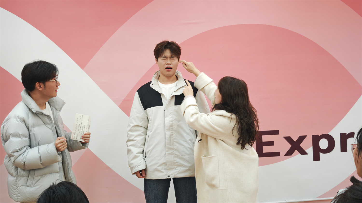 活动伊始,“破冰启航”环节以一场别开生面的无声传递小游戏拉开帷幕。同学们迅速分成四组,在没有任何语言辅助的情况下,仅靠夸张的表情、生动的肢体动作与充满张力的眼神来传递词语含义。从哭笑不得时那扭曲又诙谐的神态演绎,到害羞时低头抿嘴、脸颊微红的细腻表达,各组最终呈现的答案千差万别,有的精准契合原意,有的却跑偏得妙趣横生,直观且极具冲击力地展现了非语言表达的多样性。杨老师在点评时笑着说道:“这小小的游戏就像一面镜子,让我们看到每个人对信息的接收与传递都带着属于自己的独特滤镜,也让同学们深刻意识到,非语言表达在沟通中往往能传递出语言难以企及的微妙情绪,是构建有效交流的关键一环”。