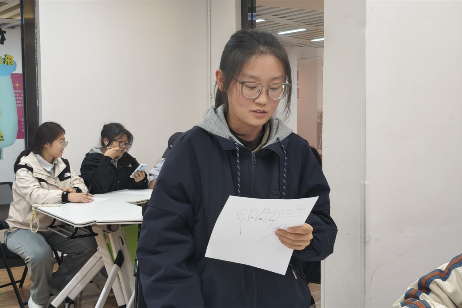 聂宁老师以“五指互动”游戏破冰,引导同学们在纸上画下自己的手印,而后分别在拇指写下最时尚的单品、食指写下最时尚的人、中指写下获取时尚讯息的途径、无名指写下秋冬必备时尚单品,小拇指留下对时尚的疑问。同学们热情参与,分享的单品从墨镜、耳饰到戒指、眼镜五花八门;认为时尚之人涵盖明星、同学、朋友乃至自己;获取时尚讯息的途径包括时装发布节目、时尚杂志、音乐专辑封面等;秋冬必备单品则有羊毛大衣、羽绒服、皮衣等。小组交流环节中,同学们围绕这些内容热烈讨论,现场活跃的氛围,让同学们的话匣子瞬间被打开,也为后续的时尚认知重构奠定了互动基础。