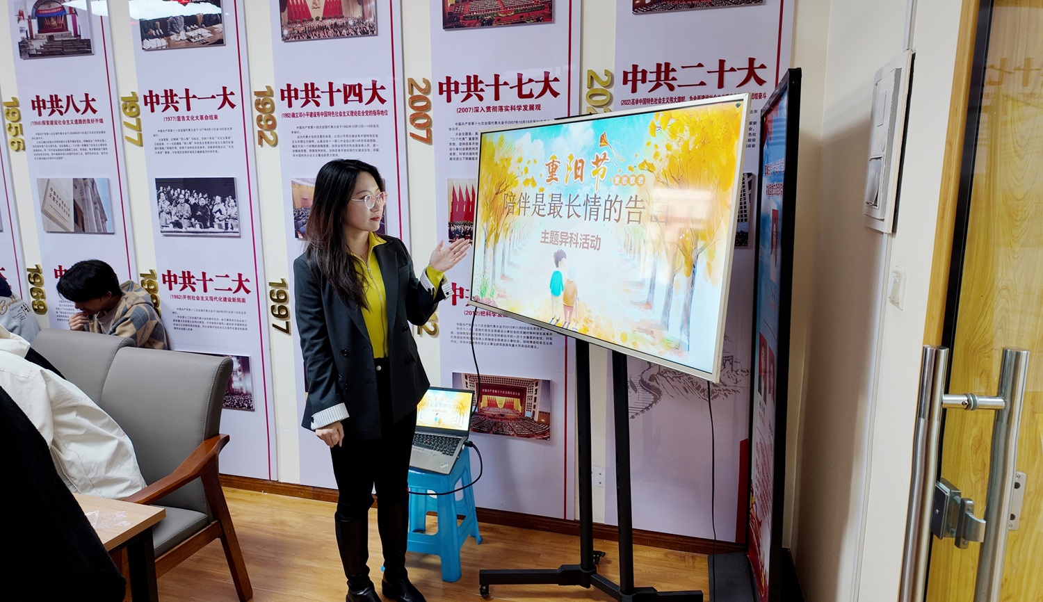 随后,活动进入重阳文化分享环节。卫娜老师围绕“重阳起源”展开讲解,从战国时期《楚辞》中“集重阳入帝宫兮”的记载,到魏晋时期重阳节逐渐形成登高、赏菊习俗的演变,再到唐代被正式定为民间节日的历史脉络,她娓娓道来,让同学们清晰了解到重阳节的发展历程。在“重阳习俗”部分,卫老师通过图片展示与故事讲述,详细介绍了登高祈福、插茱萸辟邪、赏菊饮酒、吃重阳糕等传统习俗,让同学们对这一传统节日有了更全面的认知。而在“重阳诗词”环节,卫老师带领同学们齐声朗诵王维的《九月九日忆山东兄弟》、李白的《九月十日即事》等经典诗作,“独在异乡为异客,每逢佳节倍思亲”的悠扬诗句在书院回荡,同学们在诗词的浸润中,深切感受到古人对重阳佳节的情感寄托。