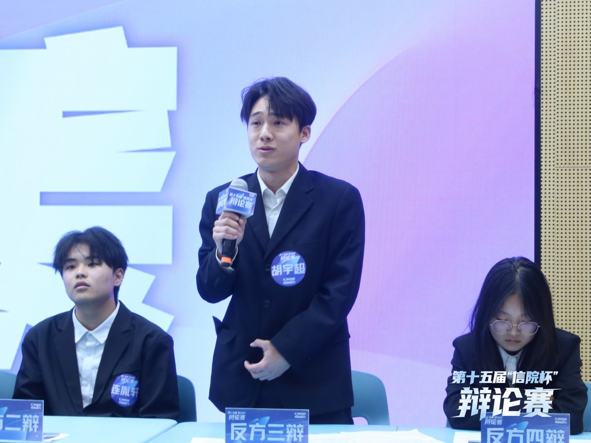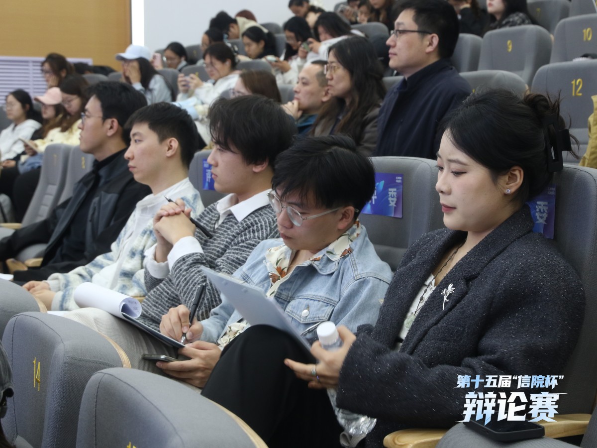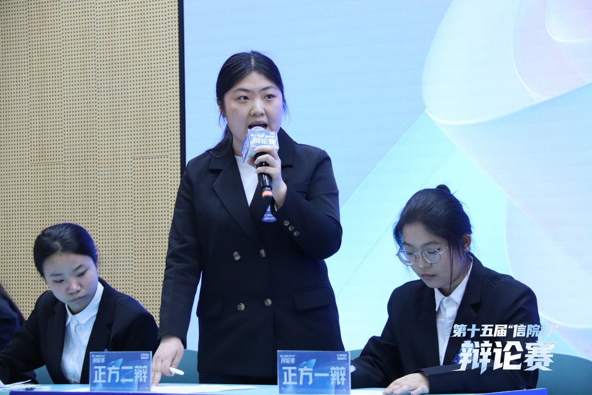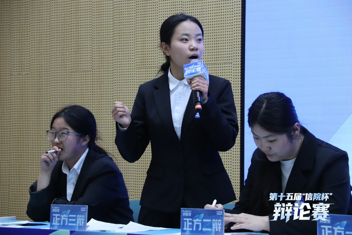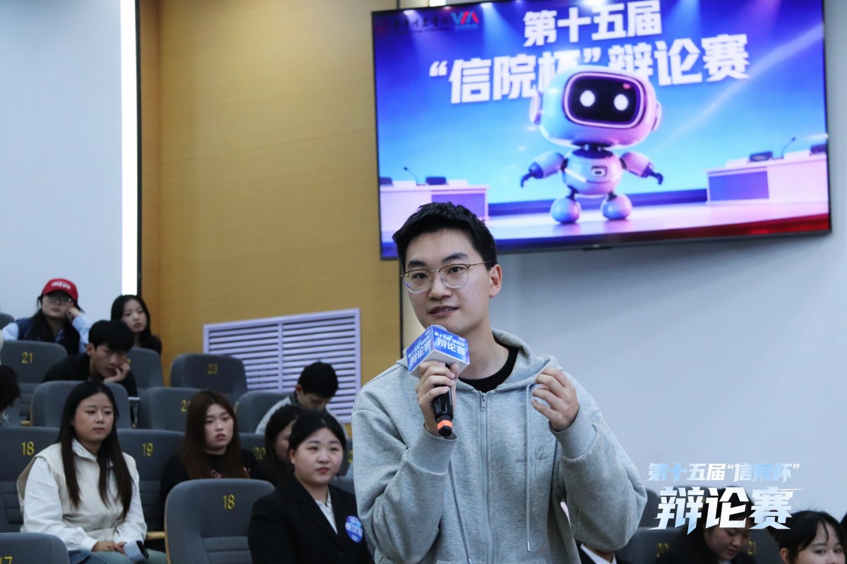 第十五届“信院杯”辩论赛的赛场,是辩手们进阶成长、展现实力的舞台。从小组循环赛的精准攻防,到决赛的巅峰对决,再到AI跨界辩论的创新尝试,每一场比拼都彰显着信院辩手的专业素养与思辨深度。赛场上辩手褪去青涩,以严谨的逻辑、流畅的表达,将青年对时代的思考、对价值的坚守融入辩词,在思想碰撞中锤炼自我、共同成长。