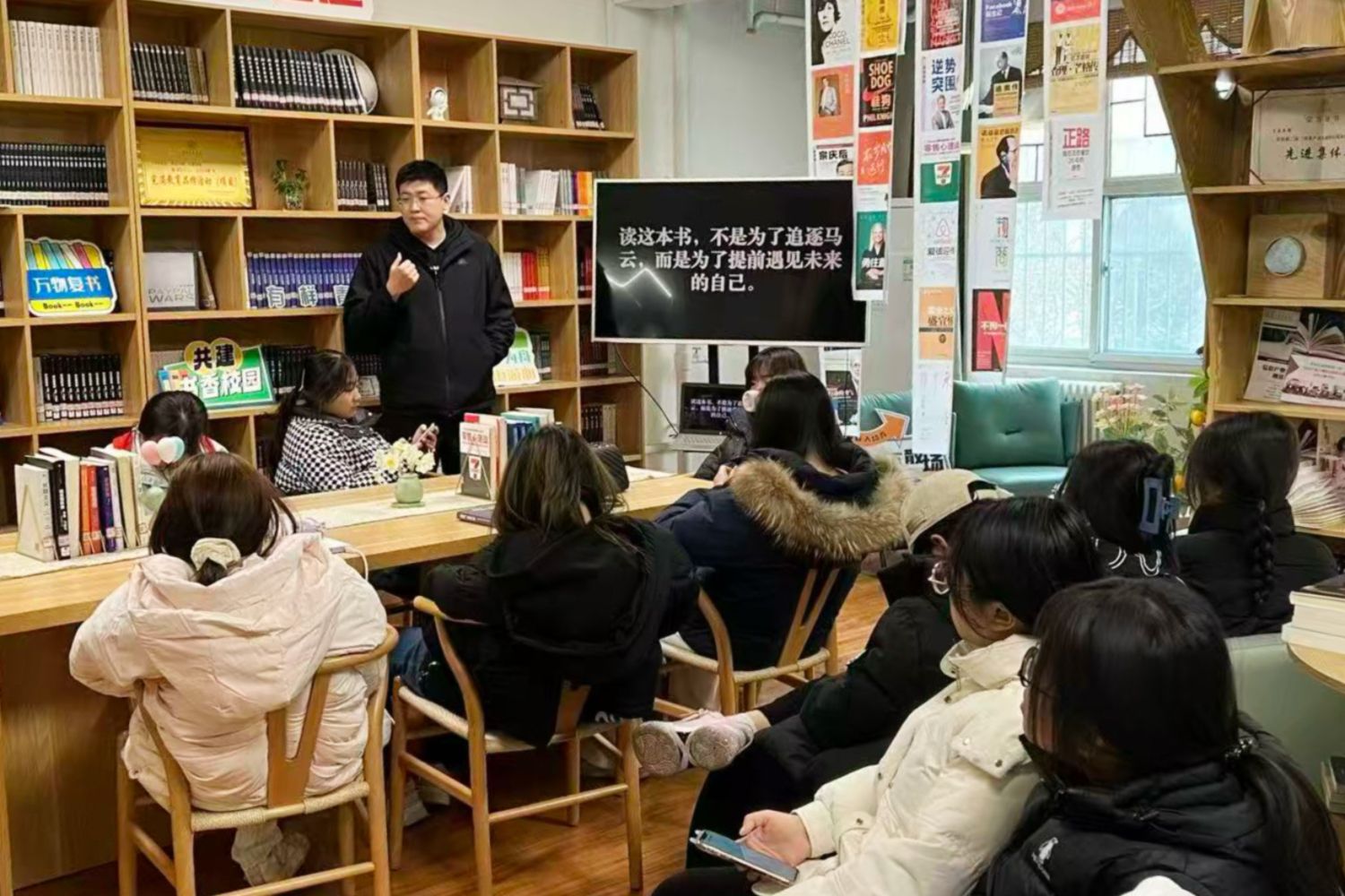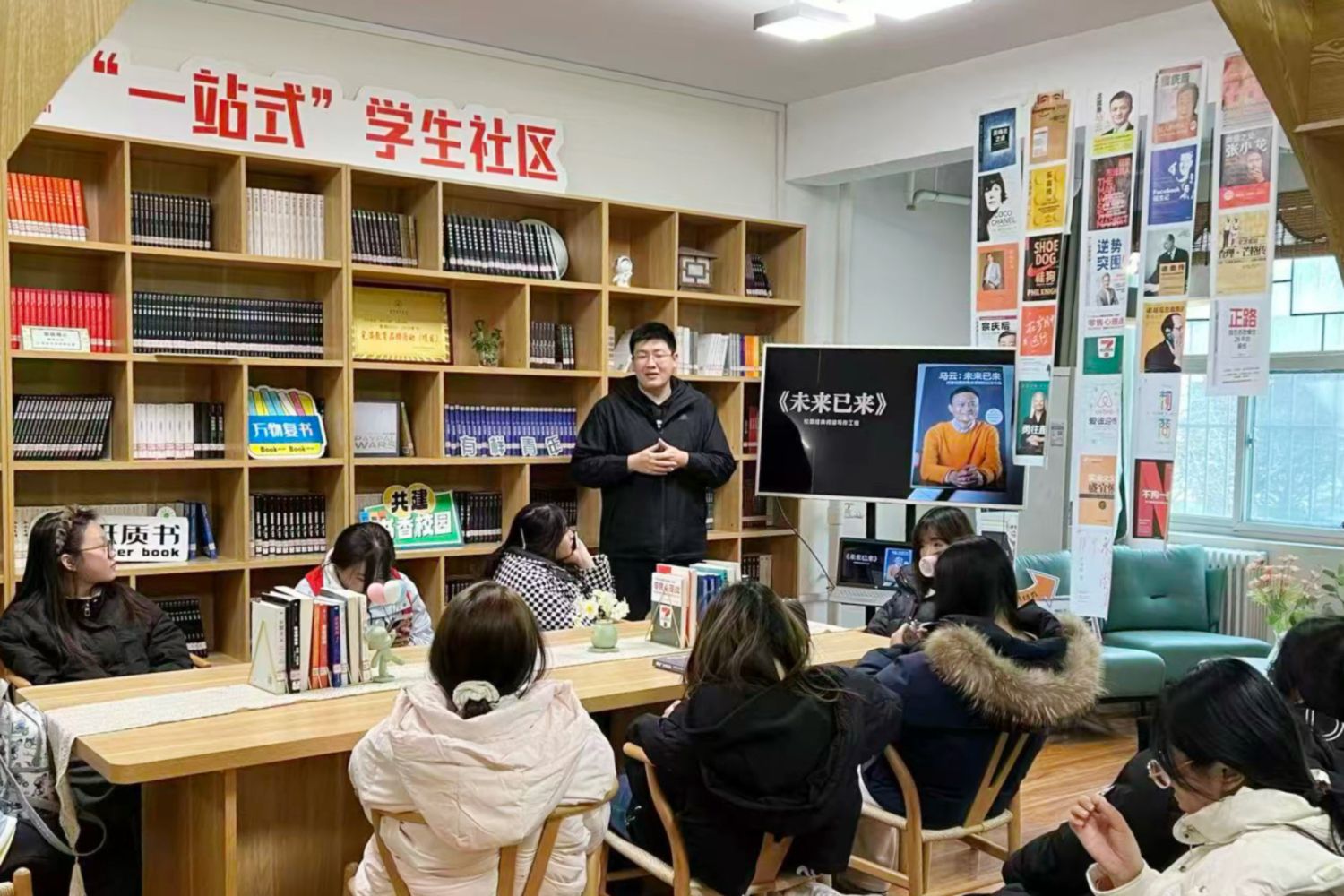 冬意初现,青藤书院102 大咖·故事里却因一本书的翻开而格外温暖。11月26日14:00,【语言与商科】第十九期:“知行·共读”系列阅读活动正式启幕,39名英语专业学生围坐一堂,开启了一段关于阅读、思考与未来的深度探索之旅。本期阅读书目为马云《未来已来》,旨在引导学生于文字间洞察趋势,在阅读中认清自我。