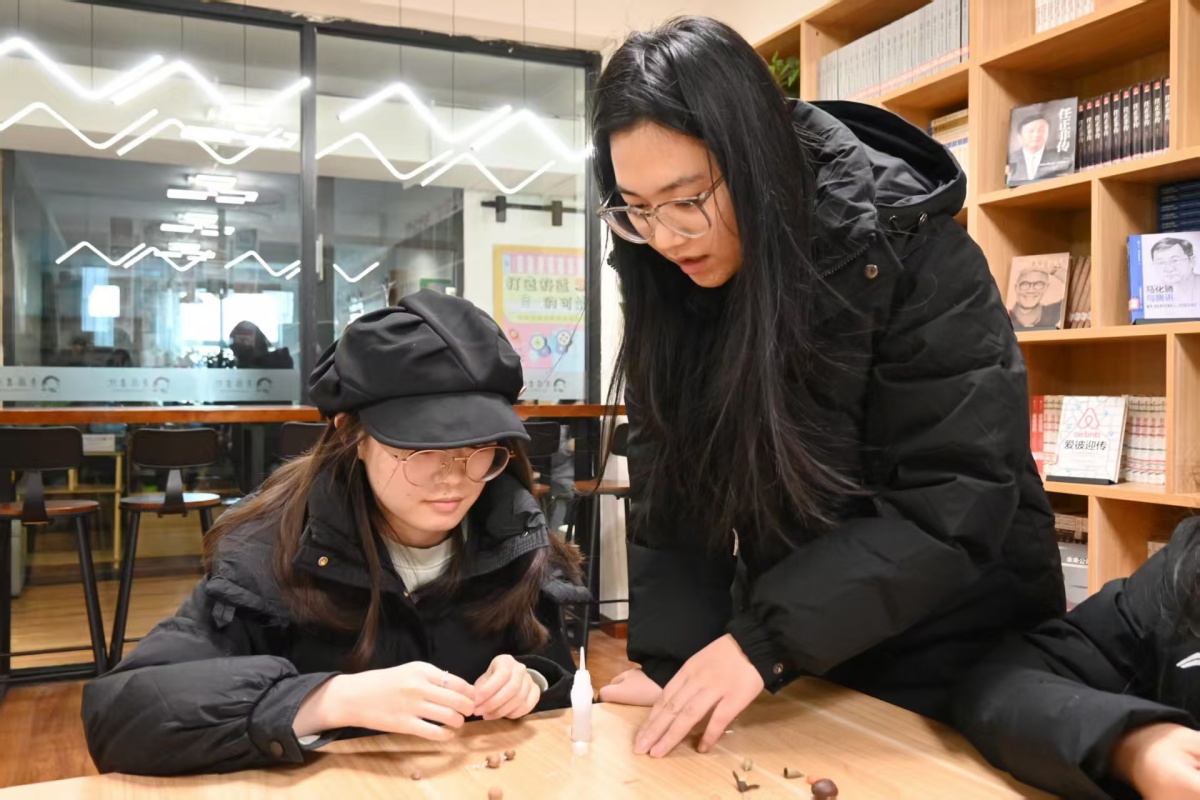 “这些看似已‘完成使命’的干枯果实,其实每一颗都是蕴藏着惊喜的自然宝藏,正等待大家用创意为它们赋予二次生命!”主持人话音未落,现场已泛起阵阵好奇与期待的低语。随后是指导环节,工作人员首先借助清晰的视频演示,细致拆解了在干果上精准打孔、稳妥固定配件的关键步骤。考虑到干果材质易碎、配件难以稳固的实际操作难点,工作人员对大家进行手把手指导,确保每位同学都能掌握技巧,让每一份材料都能物尽其用。“我现在信心十足,真想马上开始动手创作!”一位同学眼神中闪烁着跃跃欲试的光芒。