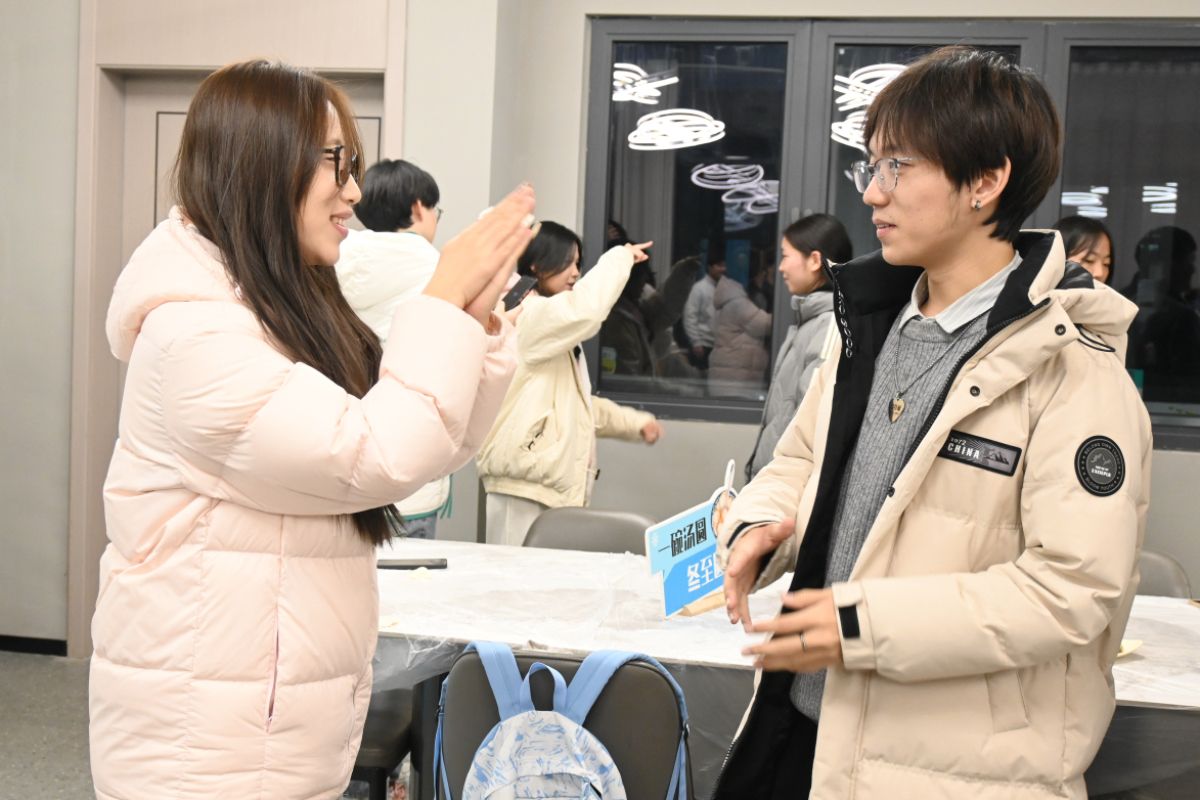 饺子皮与馅料在同学们手中翻飞成形,节目的欢声已同步响起。一首《大东北》以热烈的旋律瞬间带动了全场的节拍。紧接着,“emoji猜成语”破冰游戏让大家随机组队,靠肢体比划与团队默契接力竞猜。欢笑声不断,陌生感在游戏中悄然消融。姚院长也融入其中,几句亲切的闲聊,瞬间拉近了与同学们的距离。游戏的热闹、分享的温情,在此刻交织,许多身在异乡的学子真切地感受到了一份“此心安处是吾乡”的温情与归属。
