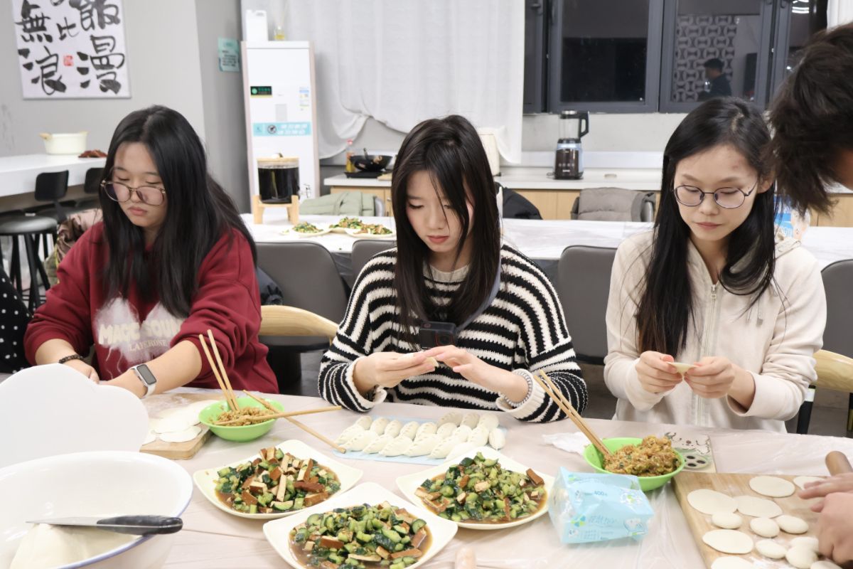 “冬至不端饺子碗,冻掉耳朵没人管!”一句俗语瞬间点燃现场氛围。现场精心准备了饺子皮、鲜肉、蔬菜等全套食材,静候一场关于温暖与团圆的手作盛宴。书院名誉院长姚歆先生笑意盈盈、挽袖加入,同学们围桌而坐、各显身手,擀皮、包馅、捏边……元宝形、月牙形、麦穗状等各式饺子渐渐摆满餐盘。在协作与交谈中,节气不再只是书上的名词,而变成了指尖可触的温度与形状。
