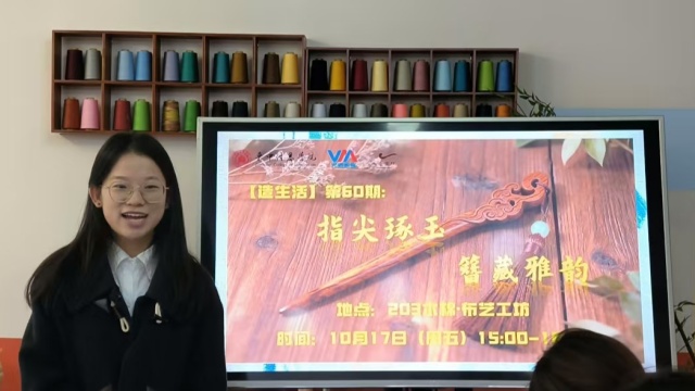 玲珑云髻生花样 飘摇凤钗映霞光,在木棉·布艺工坊的一勾一缀里,非遗匠心与青春巧思于簪头珠翠间,正续写东方美学的当代诗行。10月17日15:00,无边书院于203木棉·布艺工坊举办了【造生活】第60期:指尖琢玉,簪藏雅韵活动。本次活动聚焦国风发簪的DIY创作,同学们在沉浸式体验中感受了非遗工艺与现代设计的交融,领略到国风手作的独特魅力。