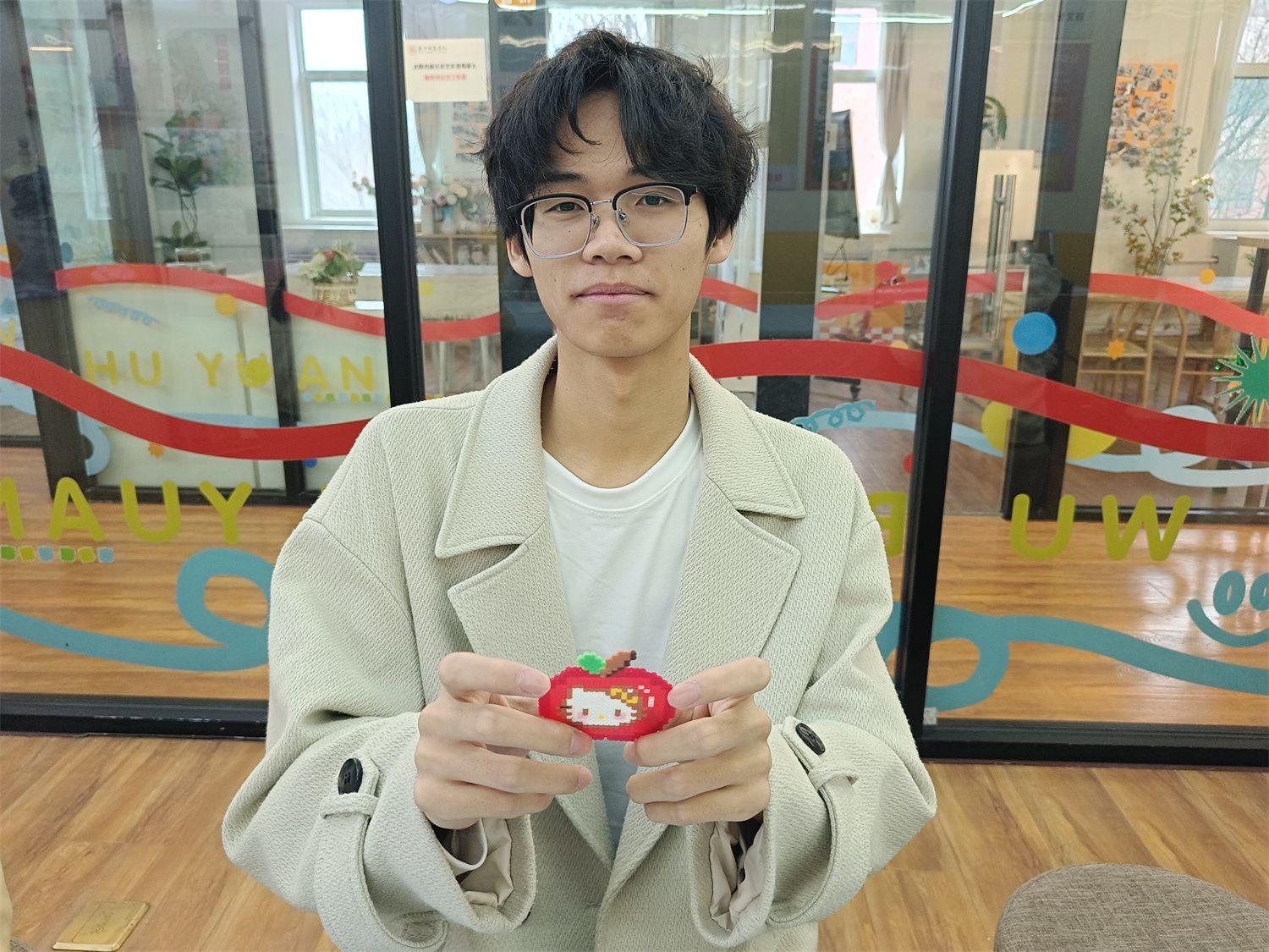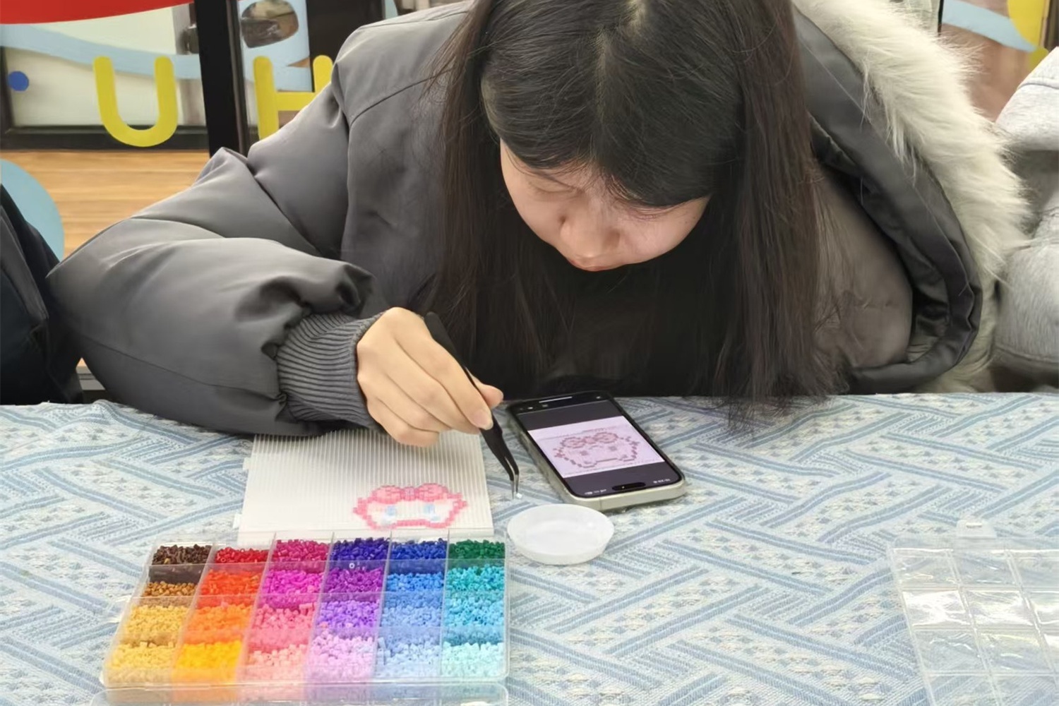 动手创作时,同学们才发现小小的拼豆藏着不少学问。有人纠结图案,有人犹豫配色,有人因摆放不够规整而略显急躁。组织者主动上前耐心引导,帮助大家选择清新的春日色系,教授对齐格子、丰富造型的技巧。“豆子很小,慢慢来,一颗一颗认真摆,就会很漂亮。”亲切的话语如春风拂面,使同学们渐渐放松下来,找到了创作手感。现场暖意融融,大家交流思路、分享灵感,一颗颗零散的拼豆,在指尖慢慢拼凑出小花、蝴蝶、云朵与新芽,春意盎然。