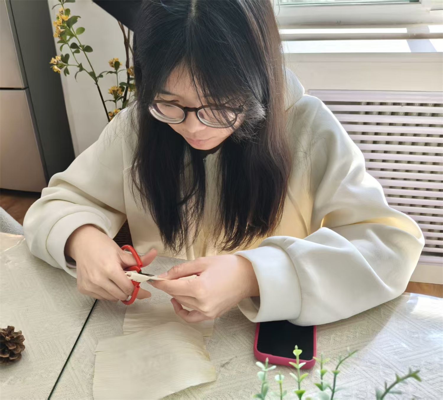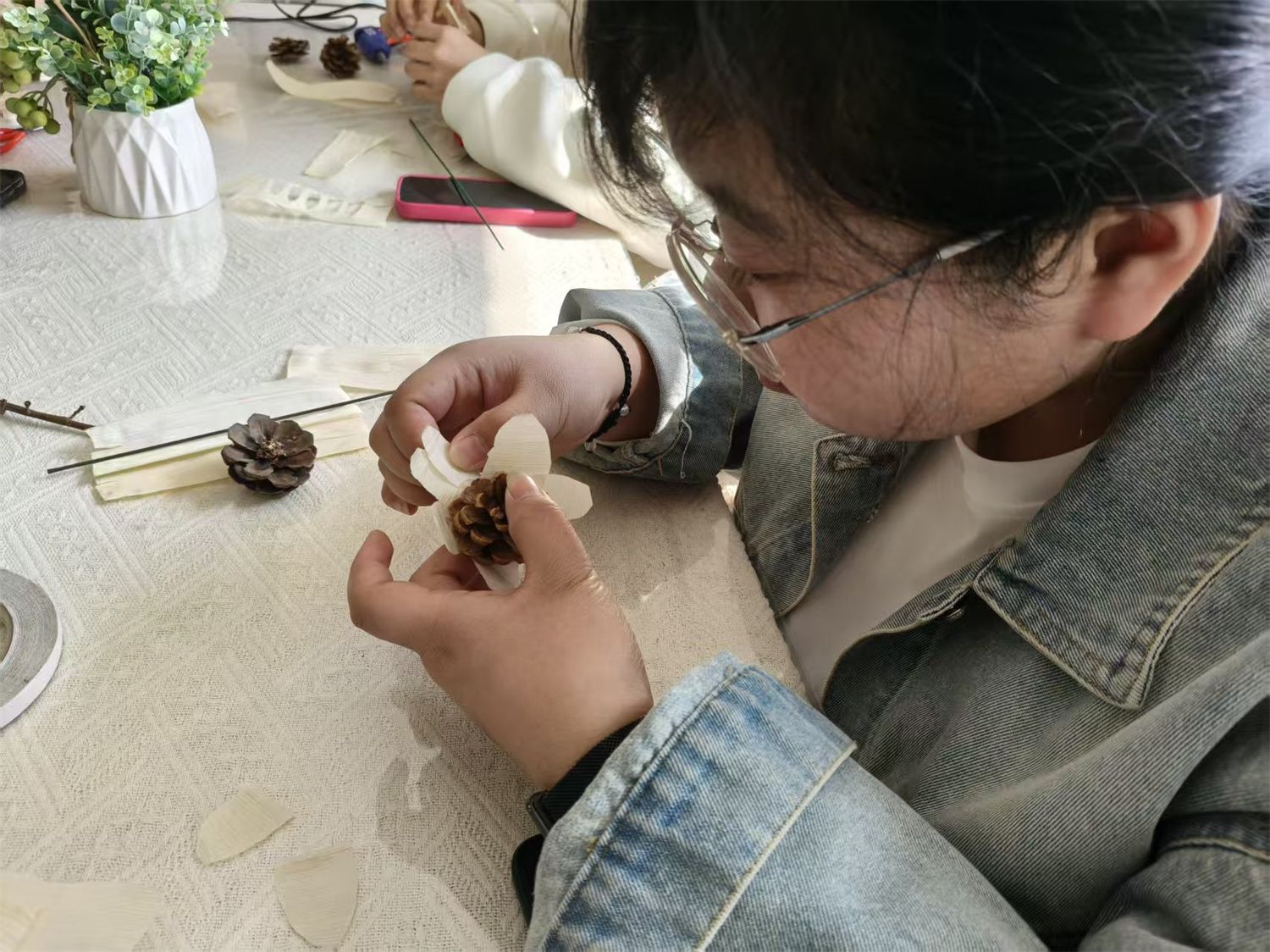 活动伊始,组织者早已备好材料。洁白柔软的玉米叶、自然的松果、热熔胶枪、树枝与剪刀。这些带着泥土气息与阳光温度的乡野素材,瞬间点燃了大家的创作热情。“开动脑筋,自由发挥,每一片玉米叶都有自己的纹理,你们要做的就是发现它的美。”在鼓励下,同学们纷纷拿起材料构思创作。关紫赟同学层层叠叠,指尖绽放出雏菊般的花朵;狄圣美同学将松果与玉米叶结合,作品充满山野意趣。一剪一贴间,平凡的玉米叶化作一枝枝独具匠心的花束,仿佛把整个春天收进了掌心。