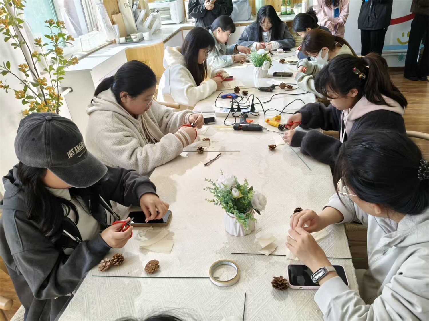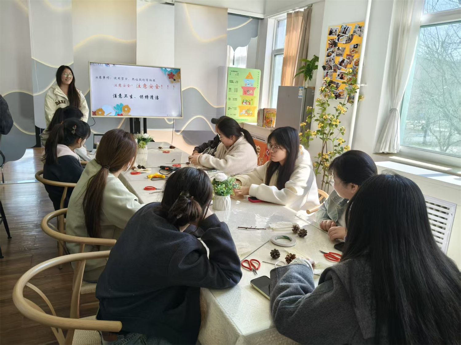 作品陆续完成,配色清新、造型可爱,每一件都饱含独特巧思。同学们互相欣赏、交流心得,组织者穿梭其中,与大家分享图案与色彩的小技巧。没有喧闹的场面,只有轻松治愈的氛围,简单的分享让创作的快乐更加真切。