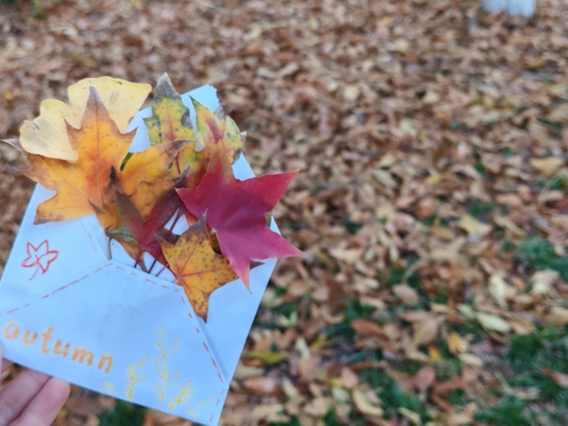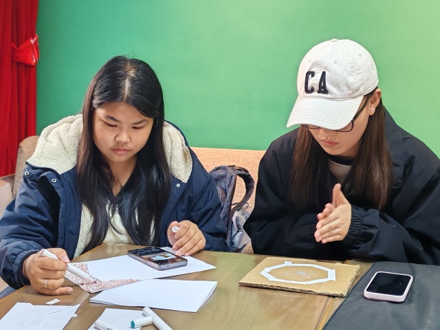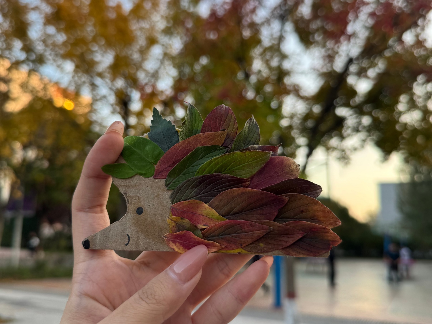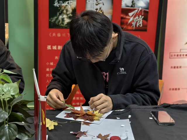 户外采风环节结束后,同学们带着精心收集的落叶与花瓣返回工坊,投入到“秋叶”手作环节中。现场已备好纸板基座、胶水、彩笔等制作材料。在轻松愉悦的氛围中,大家细致整理秋叶与花瓣,充分发挥想象力进行拼贴创作。有的同学以枫叶层叠拼出瓶身轮廓,有的将小花细心地点缀其间作为装饰,还有的巧妙利用枫叶制作出“小刺猬”等生动造型,在交流协作中,一件件素朴的纸板逐渐蜕变为独具秋意的“专属作品”。