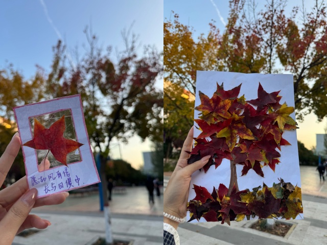 摄影教学结束后,同学们走出教室,在校园中开展实地拍摄。大家以手机为工具,将课堂所学的构图与用光技巧运用于实景创作。景观大道上,同学们或俯身捕捉落叶飘落的瞬间,或仰拍留存枝头最后的绚烂;草坪与花圃边,三五好友默契配合,共同探索人景融合的拍摄角度。整个校园仿佛化身为开放的“秋日摄影实践基地”,同学们在行走与拍摄中,不仅巩固了所学知识,也同步收集了形态各异的落叶与花卉,为接下来的手作环节储备自然素材。