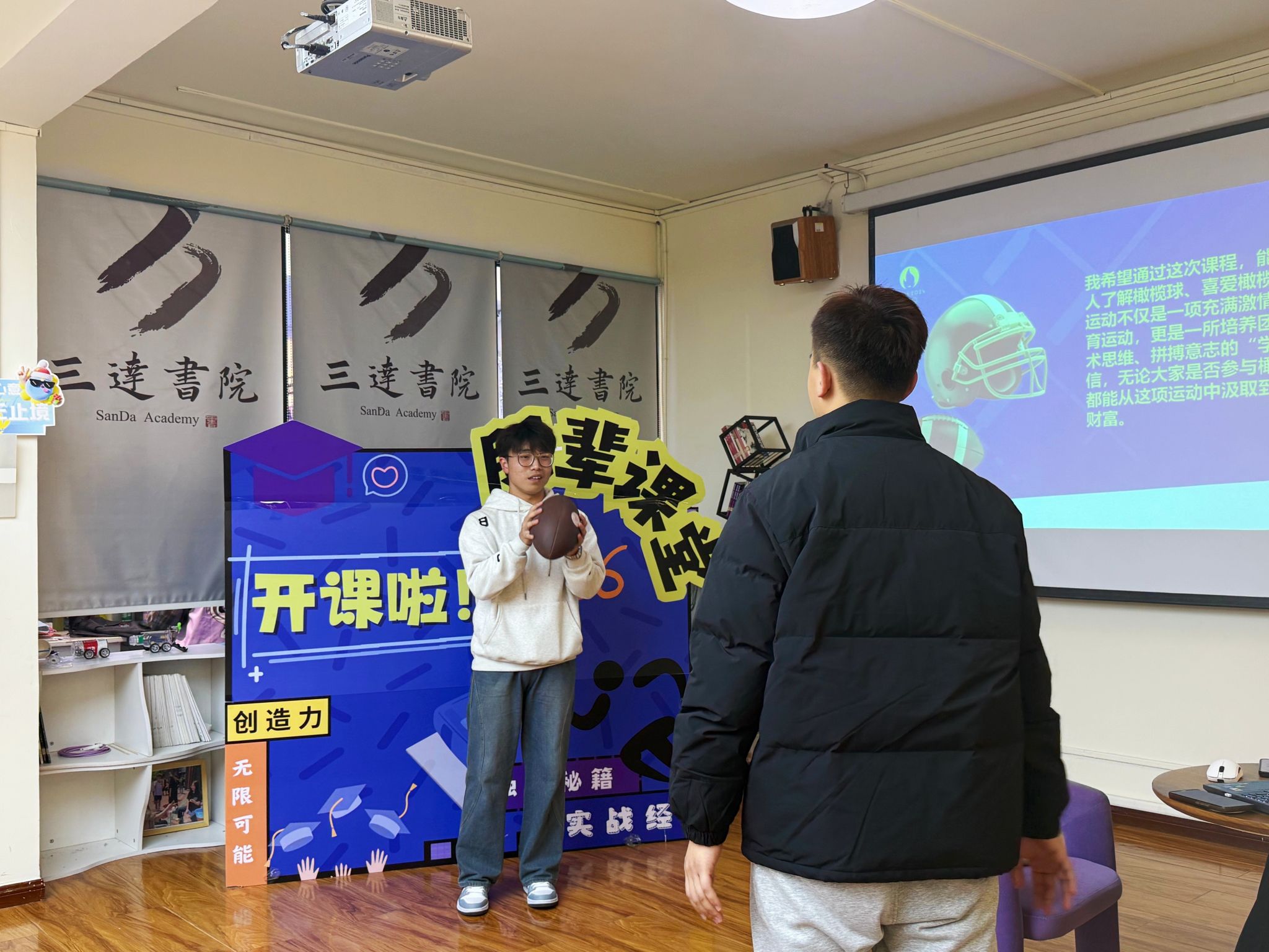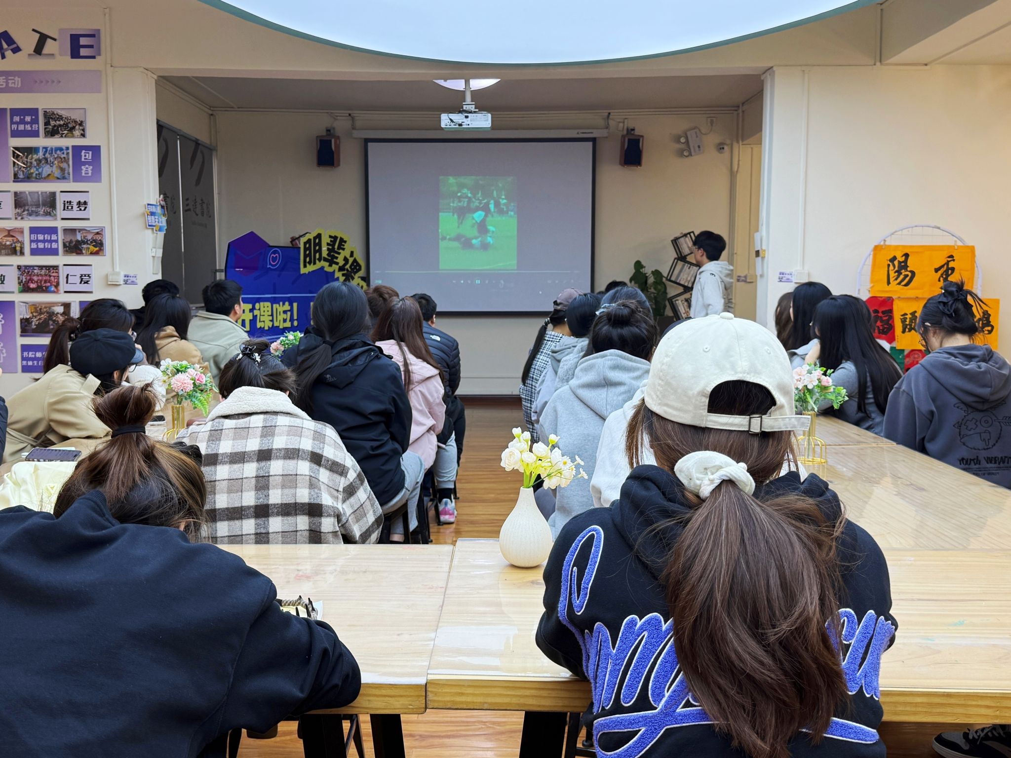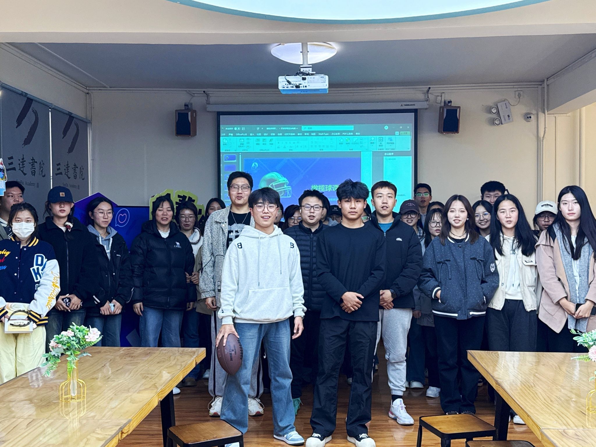 “同学们认为橄榄球只是靠蛮力冲撞吗?”石文斌以一个问题引发同学们的思考。他从19世纪英国的橄榄球起源讲起,提及这项运动如今发展出多个分支,其中美式橄榄球对抗最为激烈。结合校园实际,他简要穿插校队引进历程,随后详细介绍比赛基本规则、球员分工与得分方式,将复杂的赛场术语转化为贴近校园生活的通俗表达,帮助大家在短时间内快速建立起对橄榄球的基本认知框架。