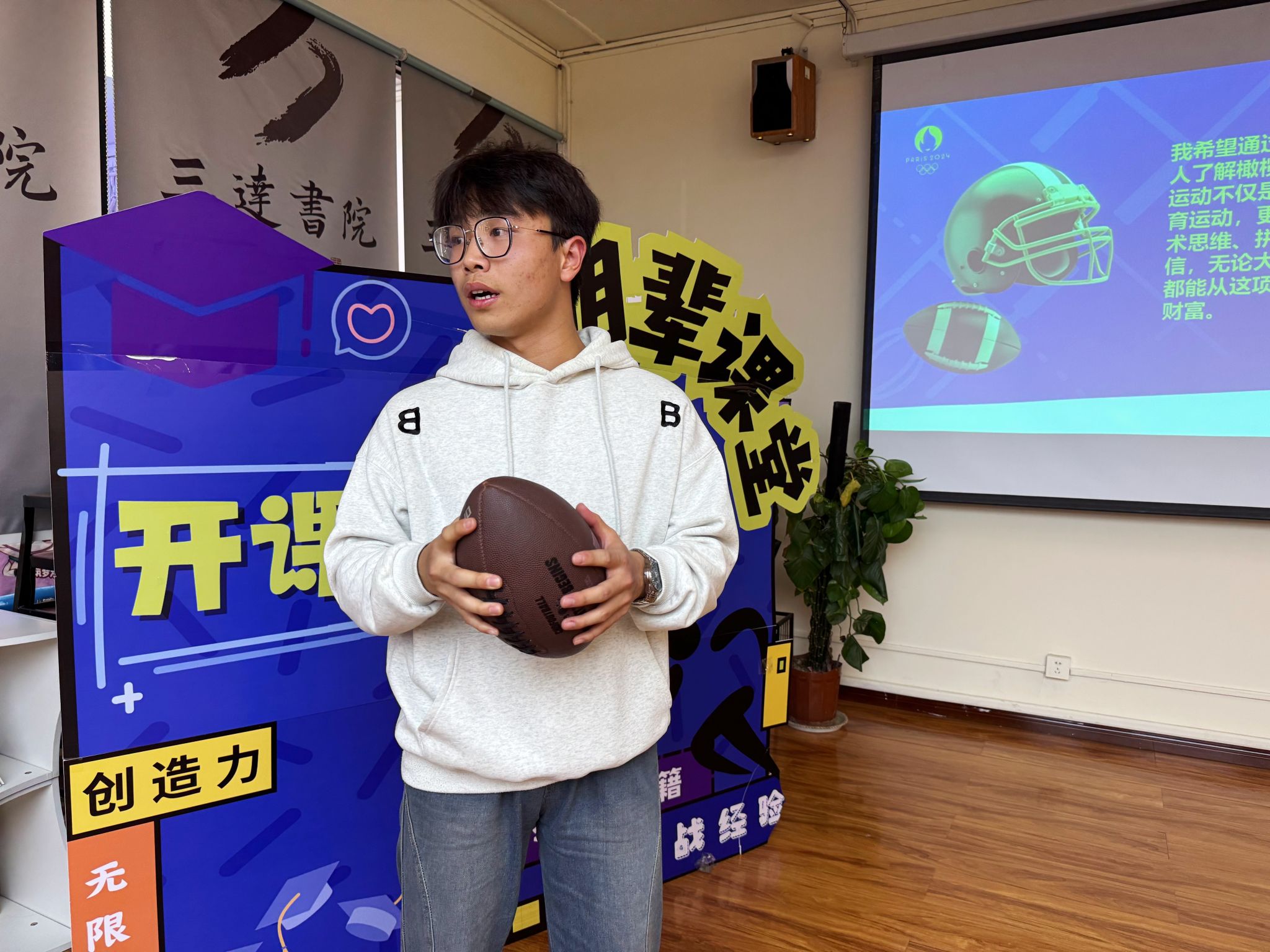 10月30日19:00,一场以“热血橄榄球,暴力与优雅”为主题的朋辈课堂(第10期)在三达书院意空间开讲。活动旨在打破学生对橄榄球“只有冲撞”的印象,系统传递其规则逻辑、战术智慧与文化内涵,为校园体育文化注入新鲜活力。本期主讲人为信息工程学院、三达书院,校橄榄球队学生石文斌,他以生动讲解与互动交流,带领同学们走进这项充满力量与策略的运动世界。