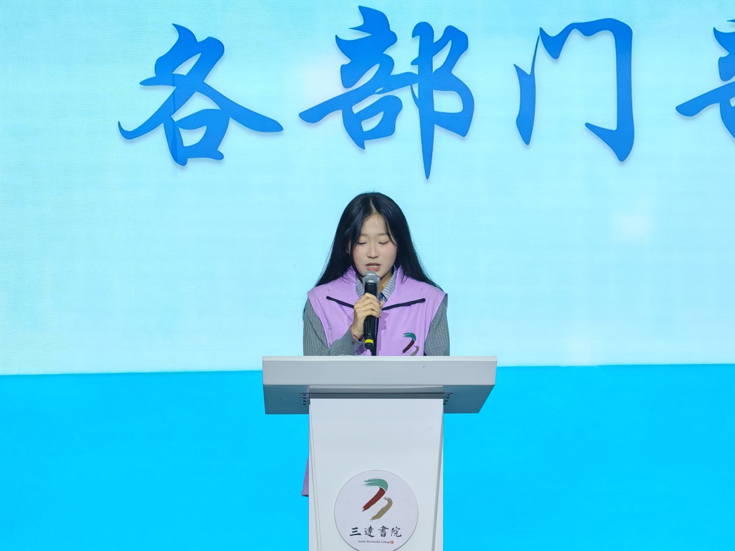 为加强书院学生干部队伍建设,明确工作方向与职责,三达书院于10月22日19:00-21:00在黑匣子剧场召开干部见面会。活动开始,第七届主席进行发言,贾力老师授花并见证书院旗交接;第八届主席、各部门部长及干事依次登台表态,展现新团队的责任与担当。书院老师为部长们授予工作牌与礼物,激励大家以“家文化”为纽带,在新征程中深耕服务、创新作为。仪式尾声,全体成员合唱《小达花开的日子》并合影,将“家”的温情与团队的信念定格。此次换届不仅是责任的传递,更是书院精神的延续,新一届学生会将以更饱满的热情,在朋辈领航、文化建设、服务师生等领域深耕细作,为书院发展注入新活力,续写“幸福三达人”的成长新篇。