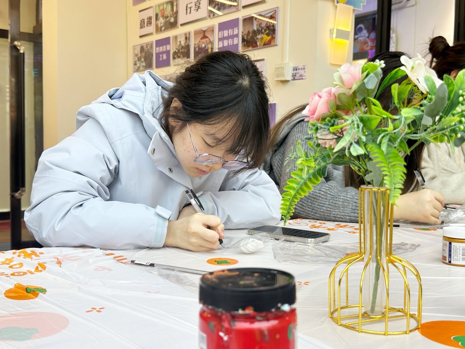 霜降时节,三达书院于书院意空间开展给生活加点仪式感(第6期)——迎霜降节气,画满枝柿暖活动。10月22日13:00-15:00,同学们在发展导师武紫东的节气课堂中,了解霜降知识与习俗。大家在暖水袋上手绘象征“事事如意”的红柿图案,武老师将绘画步骤分解为勾勒、上色、点缀,同学们或书写祝福、或构绘温馨场景,在创作中践行传统节气仪式。活动尾声,武老师与学生代表将手绘暖水袋送至书院社区,让这份手作温暖传递“家文化”。同学们在活动中既触摸到传统节气韵味,又真切感受到书院的陪伴与关怀,书院也将持续策划富有仪式感的特色活动,打造温情成长港湾。