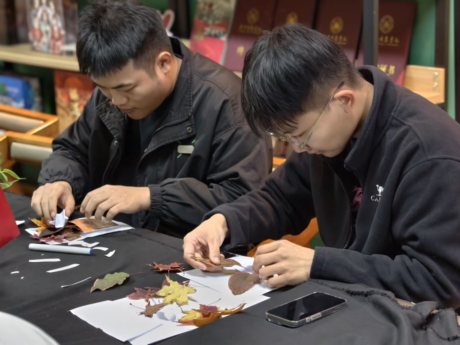 10月17日16:00-17:30三达书院红色剧本杀工坊开展了共创赋能站(第72期):捕捉秋意·定格美好活动。活动中,同学们走出教室,捕捉校园金色银杏、拐角火红枫叶等秋景,拾取落叶,创作独特装饰画,用彩叶拼贴出灵动的刺猬、以树叶为元素设计艺术人像。大家在自然中寻觅灵感,在创作中掌握手工技能,还在分享交流里结识朋友。此次活动为学子搭建了亲近自然、释放创意的平台,让大家在秋景创作中感受生活诗意,也丰富了书院“创美育人”实践路径,助力学子在技能与审美培育中多维成长。