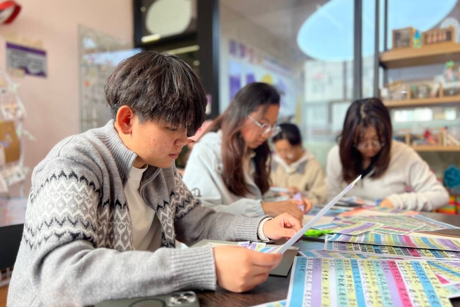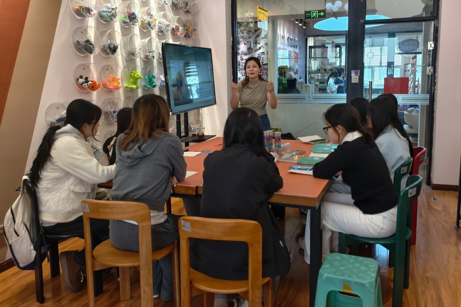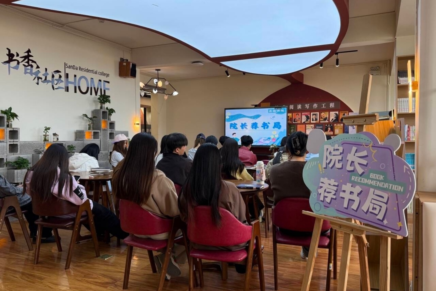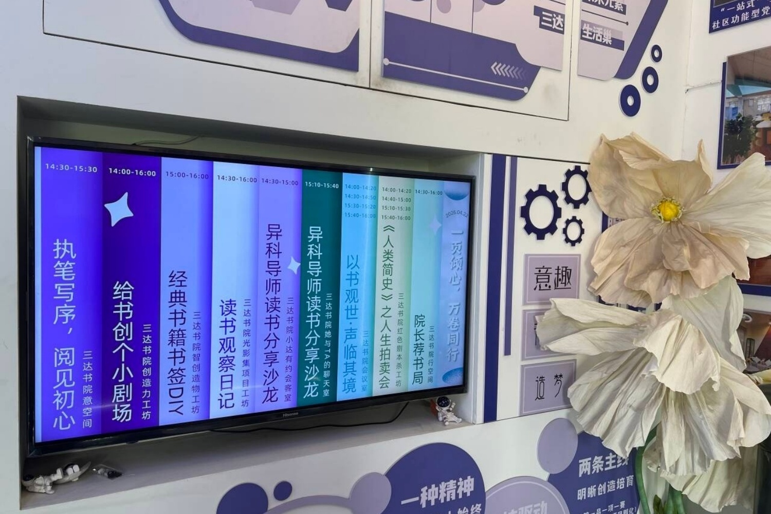 活动全面盘活三达书院社区空间,实现空间的高度利用——九大特色分场分别布置在书院的各个功能房间内,每个房间独立开展一项主题读书活动,互不干扰,学生可根据兴趣自由选择、自主穿梭。无论走进哪个房间,都能立即参与一场完整的沉浸式阅读体验,或共读经典,或动手创作,或角色演绎。为降低活动成本、节约资源,本次全面采用电子化导览:各空间电视机屏幕上统一投放活动地图,清晰标注每个房间的位置、活动简介与时间安排,替代传统纸质海报与宣传单页,既实现了信息实时更新,又减少了纸张浪费。同学们只需抬头看一眼屏幕,便可轻松规划路线,随兴参与。一时间,书院走廊里人流络绎不绝,每个活动空间内都座无虚席,数百名学生同时沉浸在书香氛围中,整个社区因阅读而焕发出浓厚的文化活力。