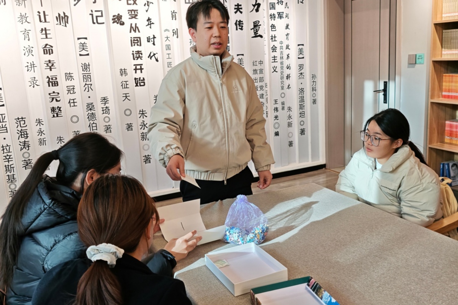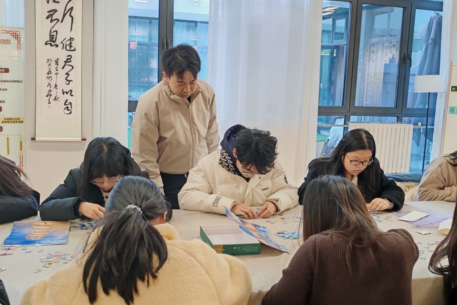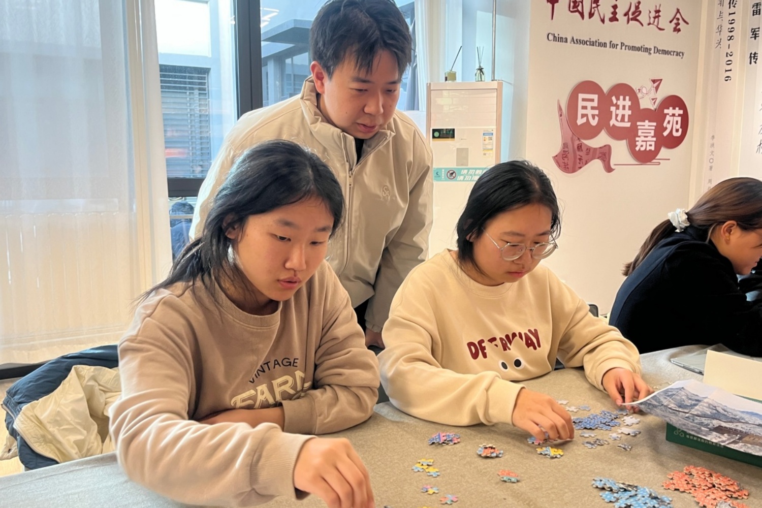 进入小组拼图实战环节,屋内瞬间充满热烈的讨论声与拼图块碰撞的清脆声响。各小组四人成队,有的负责按颜色分类碎片,有的主攻建筑结构推理。“这块应该是穹顶部分,你看它的弧度!”赵静文同学兴奋地举起手中的拼图片,向队友示意。张派老师穿梭其间,不时俯身给予提示。最快完成的小组仅用二十分钟便拼出万里长城全貌,组员击掌相庆,并获得张派老师的专项奖励。在有限的时间内,团队成员不仅要比拼速度,更要精准还原建筑原貌,紧张而愉快的氛围弥漫在整个会场。