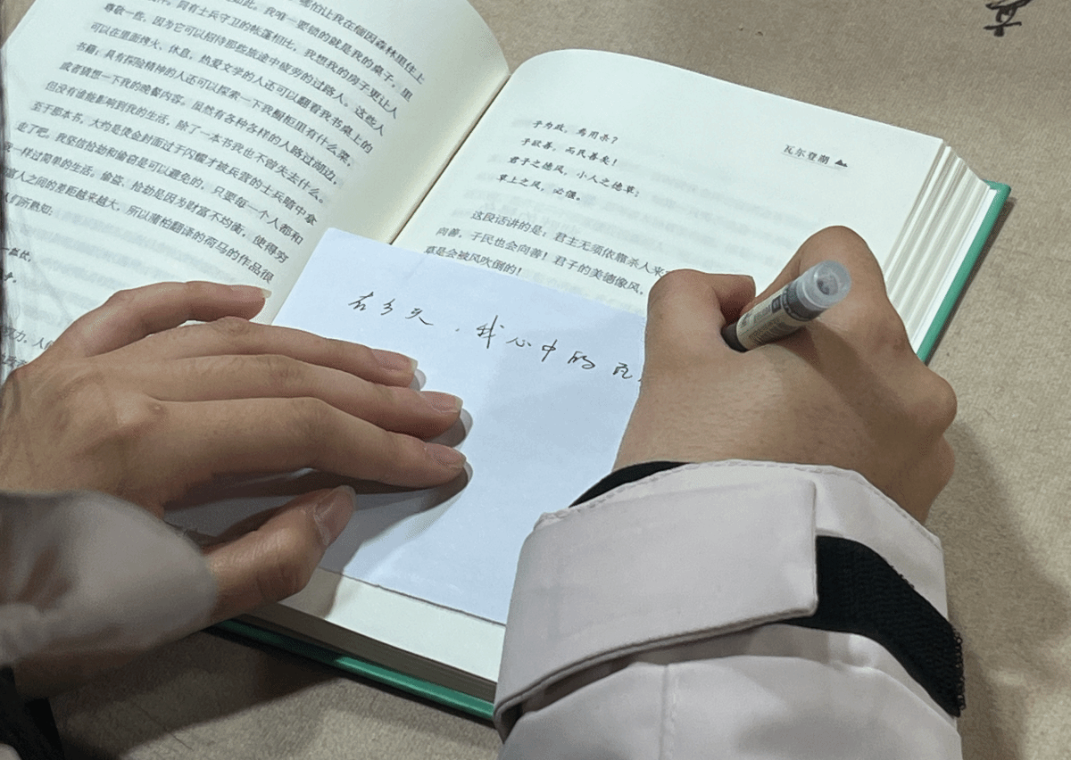 最具氛围感的观点碰撞环节,是以“在今天,我心中的‘瓦尔登湖’是______,我要的简朴是______”为主题的仿写,让同学们提笔书写专属自己的精神原乡。王宏磊同学率先分享:“我心中的‘瓦尔登湖’是温暖安稳的家,我要的简朴是卸下疲惫、回归本心的从容。”乔雯楠同学笑着接话:“我心中的‘瓦尔登湖’是自在舒展的天地,我要的简朴是不被束缚、随心而行的自由。”有人将图书馆靠窗的座位视作心灵归处,有人把傍晚的操场当作宁静港湾,字里行间皆是对生活的思考。最后在同桌互读、集体分享后,老师温柔总结:“我们向往的简朴,从来不是远离生活,而是在喧嚣里守住内心的宁静,在平凡里找到属于自己的诗意。”