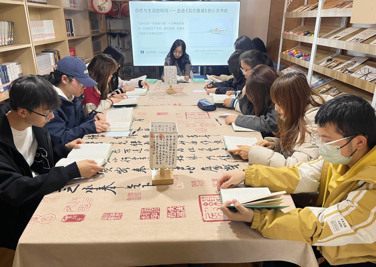 经典共读环节,师生品读《瓦尔登湖》第八章,在沉浸式阅读中感受梭罗对“平静的绝望”的叩问与对自然的向往。老师围绕“简朴、自然、清醒、内心”四大核心,结合碎片化时代的浮躁与同学们的学业焦虑展开分享,引导大家理解:梭罗的湖畔生活是向内探索而非逃避,简朴是主动选择的轻盈,自然是治愈焦虑的精神栖息地。整场分享沉稳深刻,为同学们在快节奏中守住自我、清醒成长提供了力量。