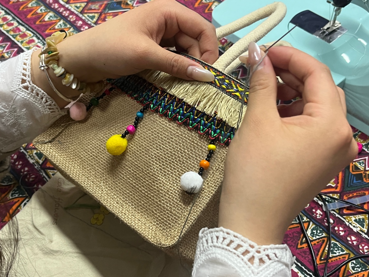 基础讲解结束后,同学们以两人一组的形式,正式开启针织创作。面对柳媛同学因衣角脱线而面露难色时,阿姨立刻俯身手把手教学,她沉稳的声音在现场响起:“线稍微带紧一点,针脚匀着来。”在阿姨的指点下,同学们小心翼翼地起针、落针。整个展厅里,除了针线触碰布料的细微声响,更多的是同学们之间的交流探讨与宿管阿姨亲切的叮嘱,原本陌生的两组同学也在共同解决衣物破损的过程中,迅速熟络起来。