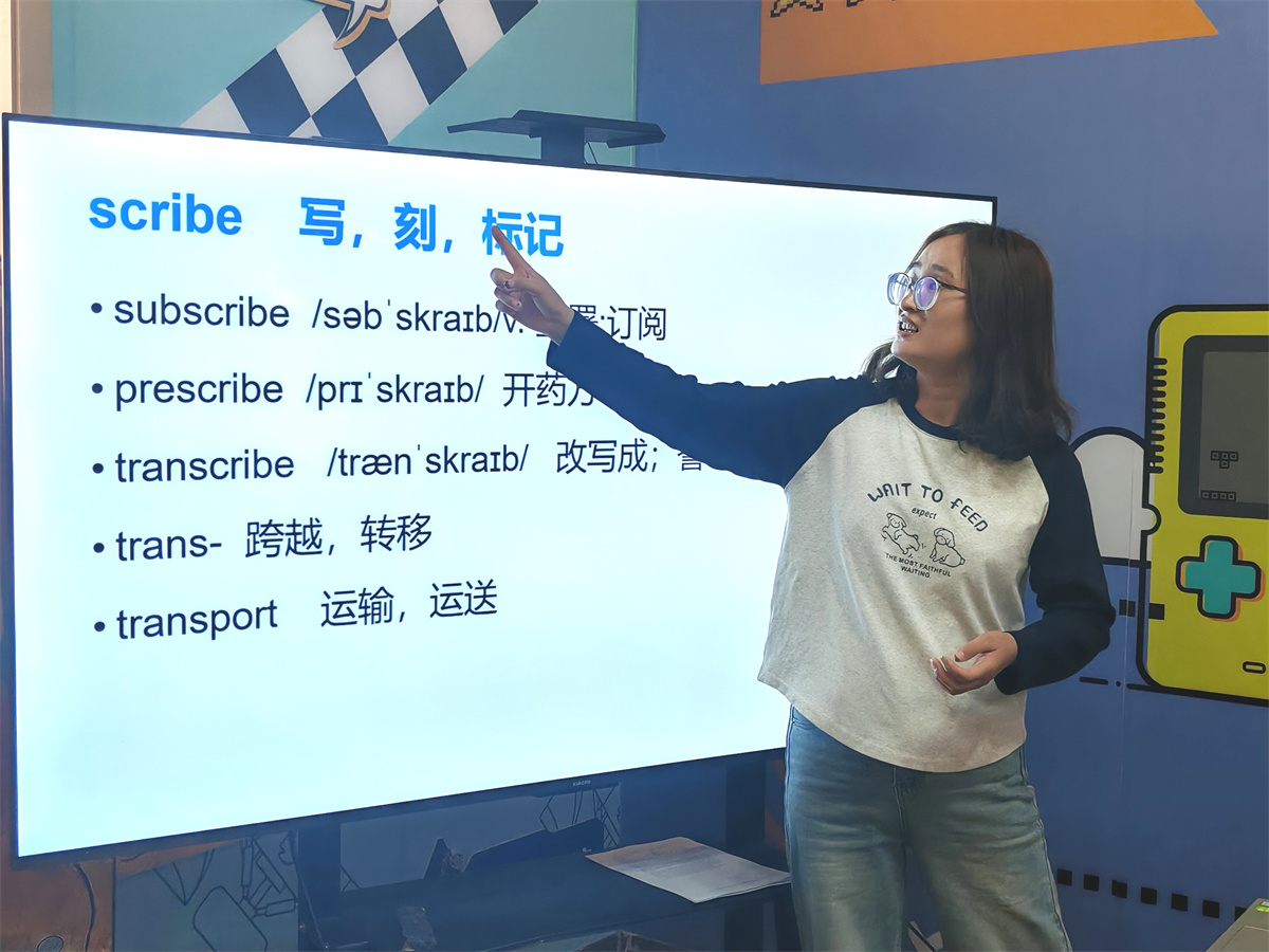 趁热打铁,赵老师开启了一分钟单词挑战。她围绕多个核心词根展开教学,如“scribe”表示“写”、“vis/vid”表示“看”、“clude”表示“关闭”等,通过词根串联法帮助同学们建立词汇网络。更让同学们印象深刻的是趣味联想记忆法——把抽象的单词变成生动的画面或谐音梗,比如把“abandon”想象成“大鹅搬凳子太重只好放弃”,让原本枯燥的单词瞬间有了画面感。短短一分钟内,大家借助这些方法高效记忆了多组单词,现场笑声不断、学习氛围热烈。