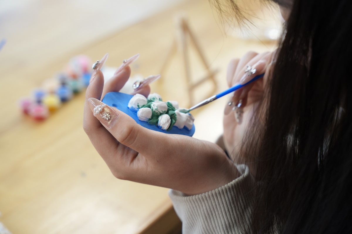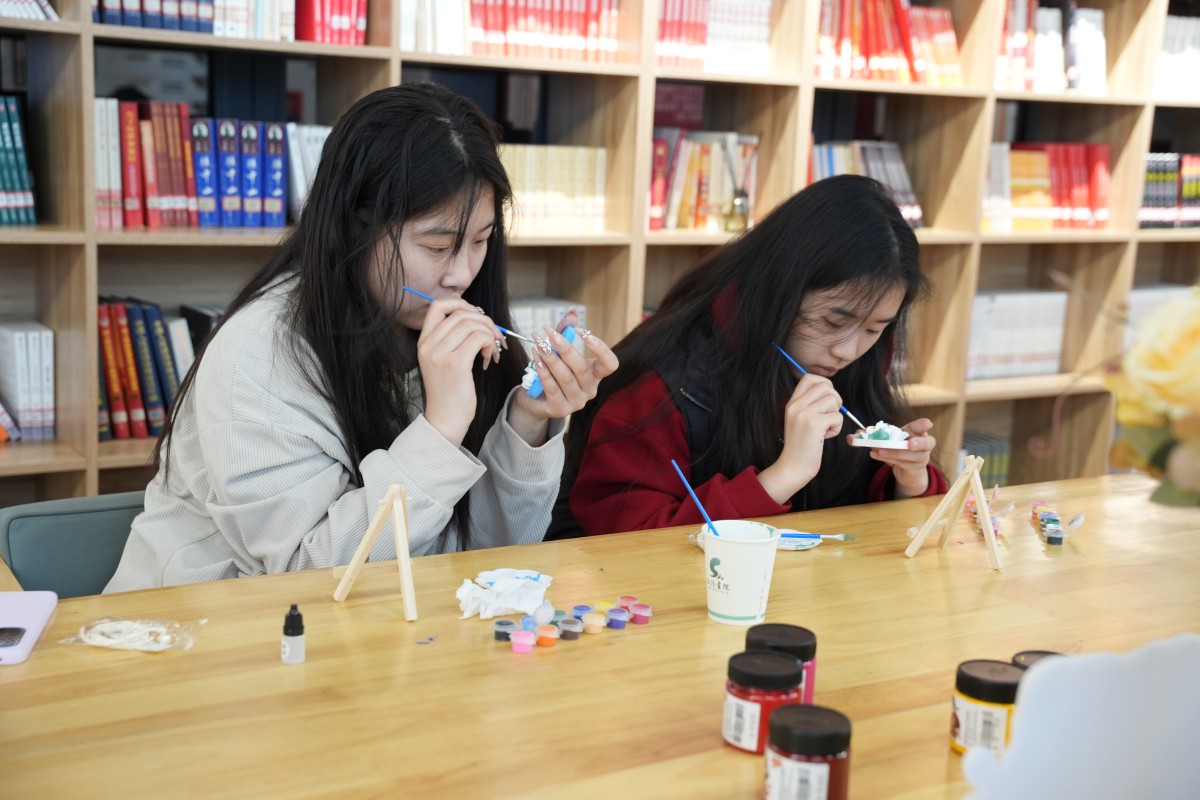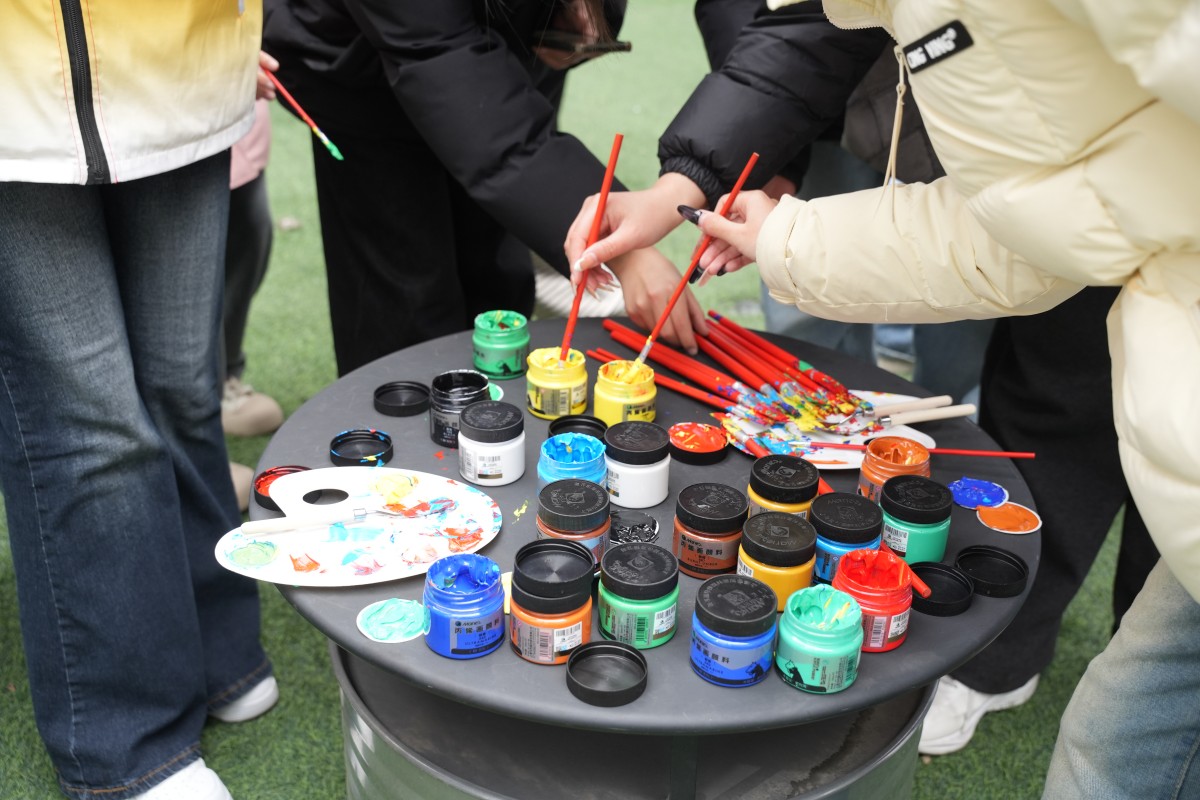 互动区的体验活动,更是将“看见她”的内核融入每一个细节:在“看见她与她”的你画我猜中,同学们用线条勾勒“独立”“坚韧”的模样,在默契互动中读懂彼此;在“指尖造物”的手作发夹体验里,干花与松果在指尖绽放,寓意着“以自然为饰,做不被定义的自己”;在“标签退退退”的肌理画创作区,同学们用颜料覆盖“柔弱”“情绪化”等刻板标签,用色彩宣告“我的定义我做主”;还有笔墨飘香的书写体验、巧思灵动的剪纸创作、色彩斑斓的石膏浮雕DIY,每一项活动都在诉说:女性的力量,藏在每一次自我表达里,藏在每一个敢于突破的瞬间。