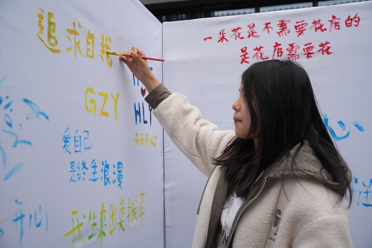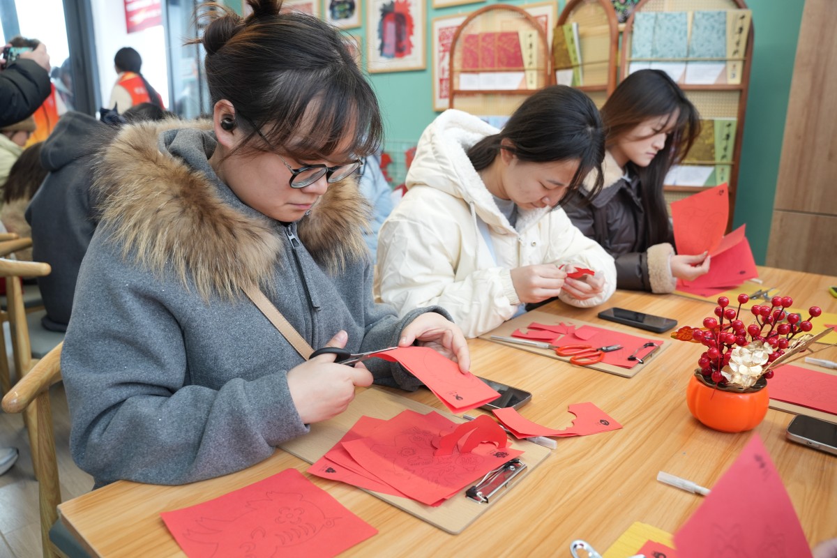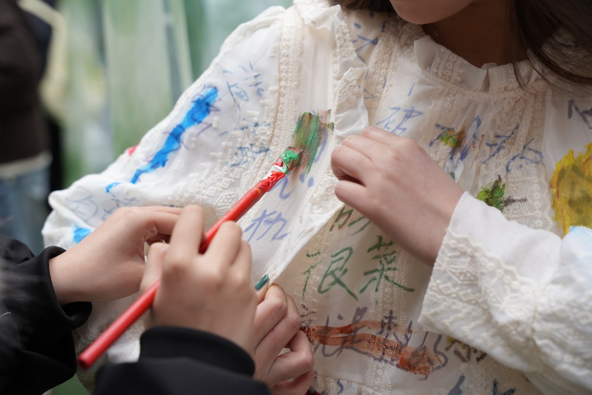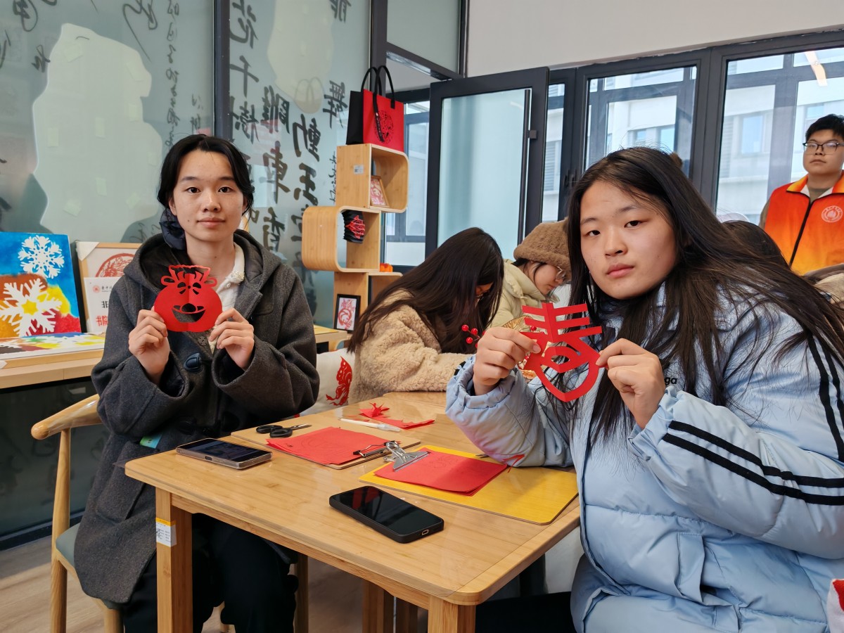互动区的体验活动,更是将“看见她”的内核融入每一个细节:在“看见她与她”的你画我猜中,同学们用线条勾勒“独立”“坚韧”的模样,在默契互动中读懂彼此;在“指尖造物”的手作发夹体验里,干花与松果在指尖绽放,寓意着“以自然为饰,做不被定义的自己”;在“标签退退退”的肌理画创作区,同学们用颜料覆盖“柔弱”“情绪化”等刻板标签,用色彩宣告“我的定义我做主”;还有笔墨飘香的书写体验、巧思灵动的剪纸创作、色彩斑斓的石膏浮雕DIY,每一项活动都在诉说:女性的力量,藏在每一次自我表达里,藏在每一个敢于突破的瞬间。