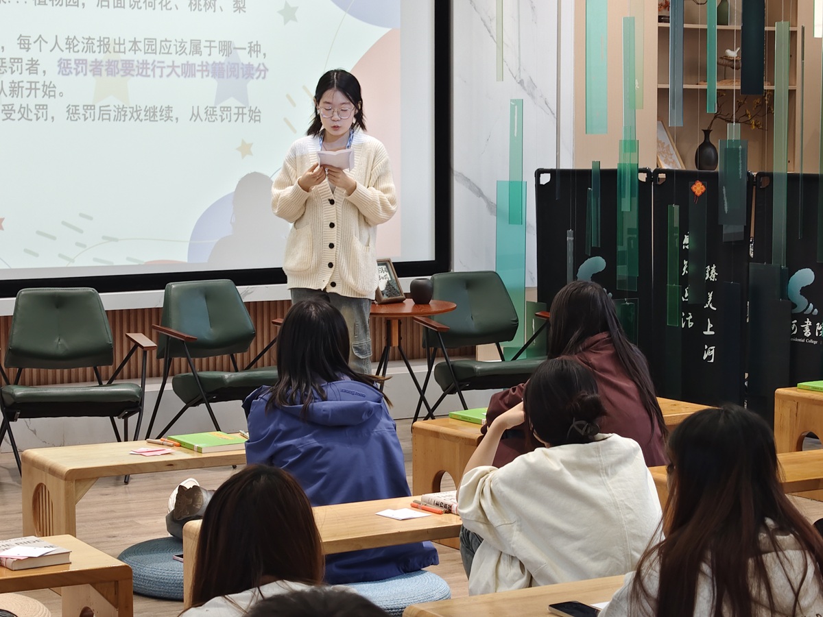 活动现场,桌面上静静躺着《诗经诵读本》《一生的旅程》《将心注入》《莎士比亚戏剧》《野蛮生长》《AI未来进行时》等书,等待着与各自的读者相遇。在同学们陆续到达并入座之后,主持人为大家带来了一个破冰小游戏——逛三园。书名园、水果园、动物园等轮番上阵,气氛瞬间热络起来。可规则偏偏有点“狠”:谁卡了壳,谁重复了别人的答案,谁就得站出来,成为当场的读书分享者。于是,一位男生在“草莓”后面卡住了,红着脸站起来;另一位女生因为说了两遍“西游记”中招,笑声与掌声交错间,原本紧张的游戏竟然慢慢放松了同学们的心情。几位“中招”的分享者陆续产生,他们进入到读书感悟发言。