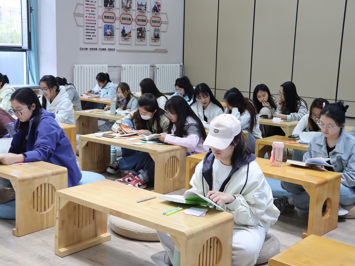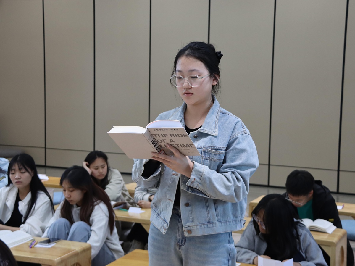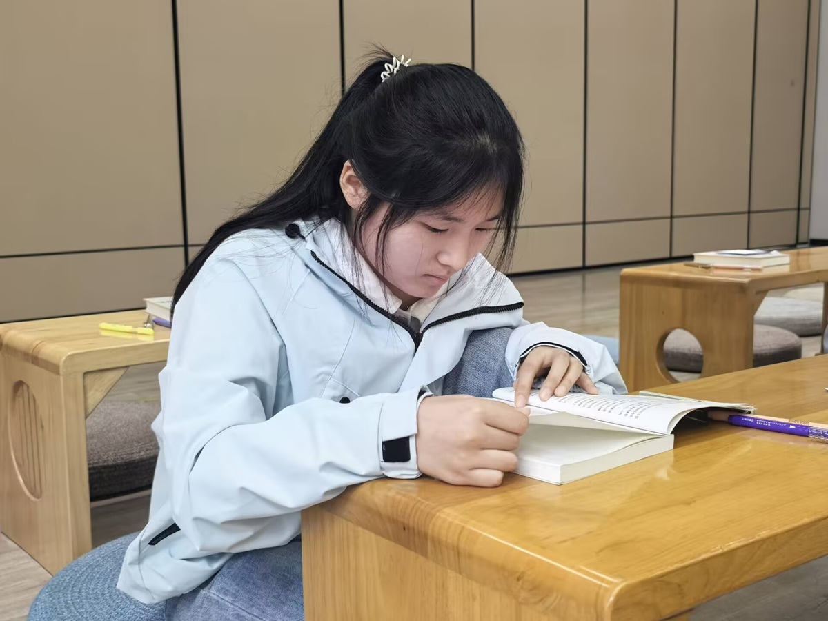 游戏的热闹渐渐退去,灯光调暗,轻音乐平滑舒缓,房间里只剩下翻书的沙沙声。同学们各自捧起心仪的书籍,沉入文字的世界——有人在《诗经诵读本》里低吟“关关雎鸠,在河之洲。窈窕淑女,君子好逑”,感受那份跨越千年的爱慕;有人翻开《一生的旅程》跟随罗伯特·艾格走进迪士尼幕后,感慨创业的艰辛;有人在《莎士比亚戏剧》中与哈姆雷特对话,也有人在《AI未来进行时》里眺望科技的边界。半小时的静读,无人言语。窗外或许有风穿过竹林,屋内只有书页被轻轻翻动的声音。这一刻,时间慢了下来,世界安静了,只有文字与目光的温柔缠绕。