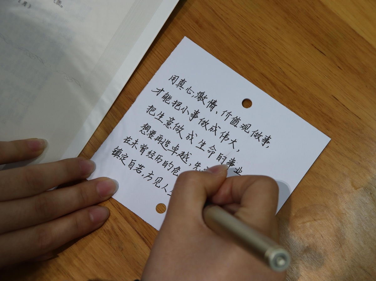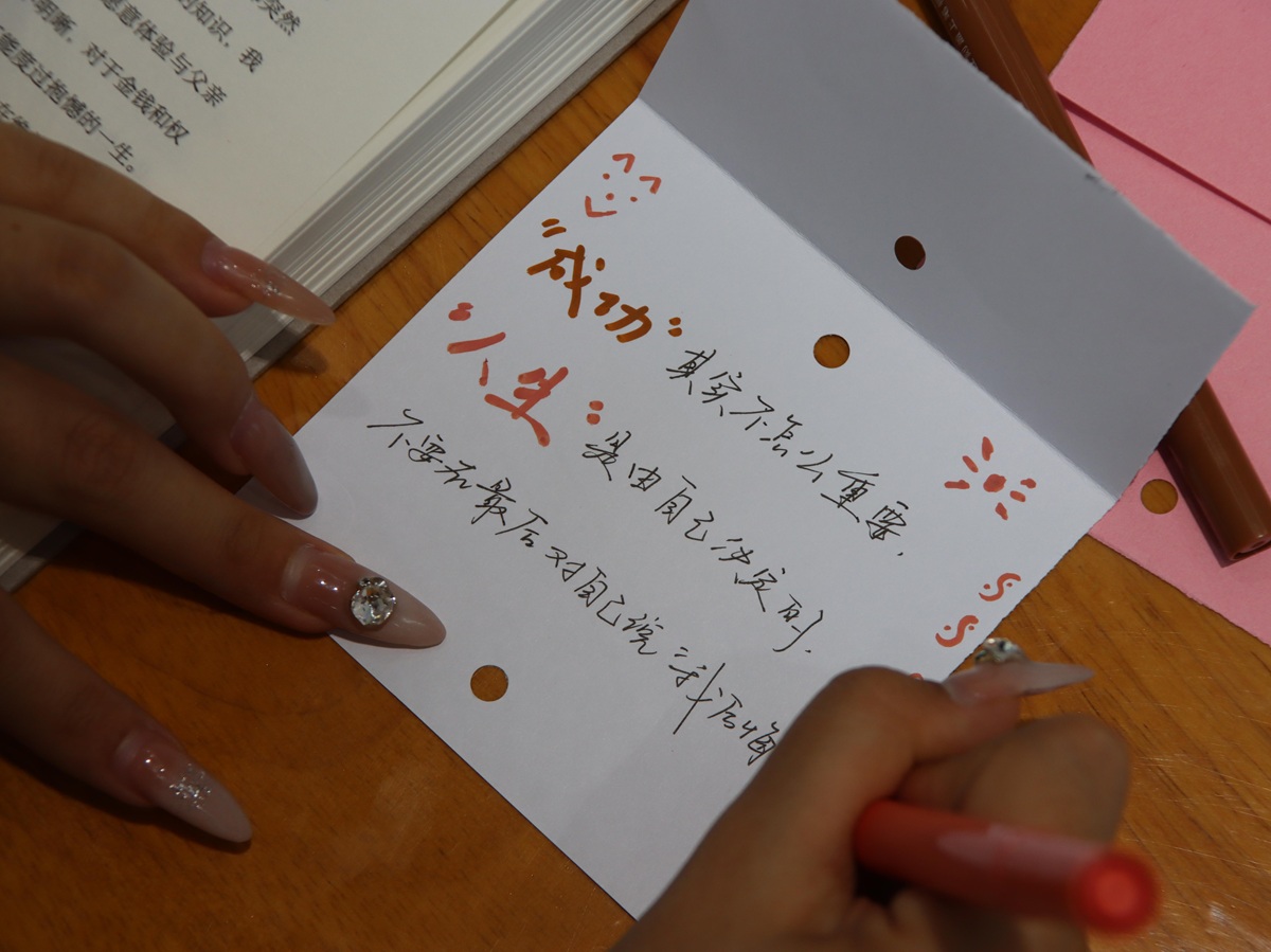 静读结束,分享者们依次起身,把自己的感悟娓娓道来。言语中,有从书中读出的亲情,能找到面对困难的勇气,虽然说的都只是一小段话,但是句句真诚。听了这些打动人心的感悟,同学们已经迫不及待了,纷纷动笔绘制卡片。一张卡片上抄着“高山仰止,景行行止”,旁边还画了高山与流水。另一张上写着几句话,写着“成功其实不怎么重要,人生是由自己决定的”,笔画很重,像是要把纸刻穿。还有一张画满了藤蔓,弯弯绕绕地缠着几个字——“野蛮生长”。卡片被一张张叠放起来,薄薄的一叠,却装满了沉甸甸的心事。
