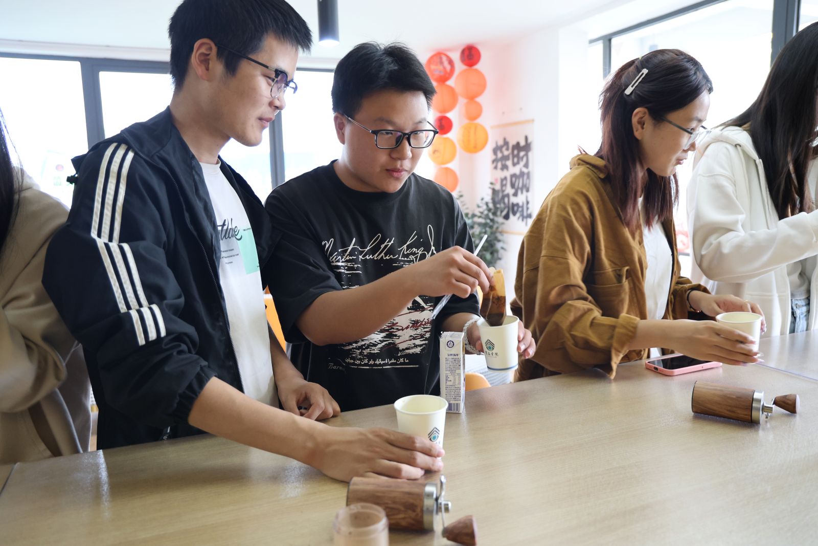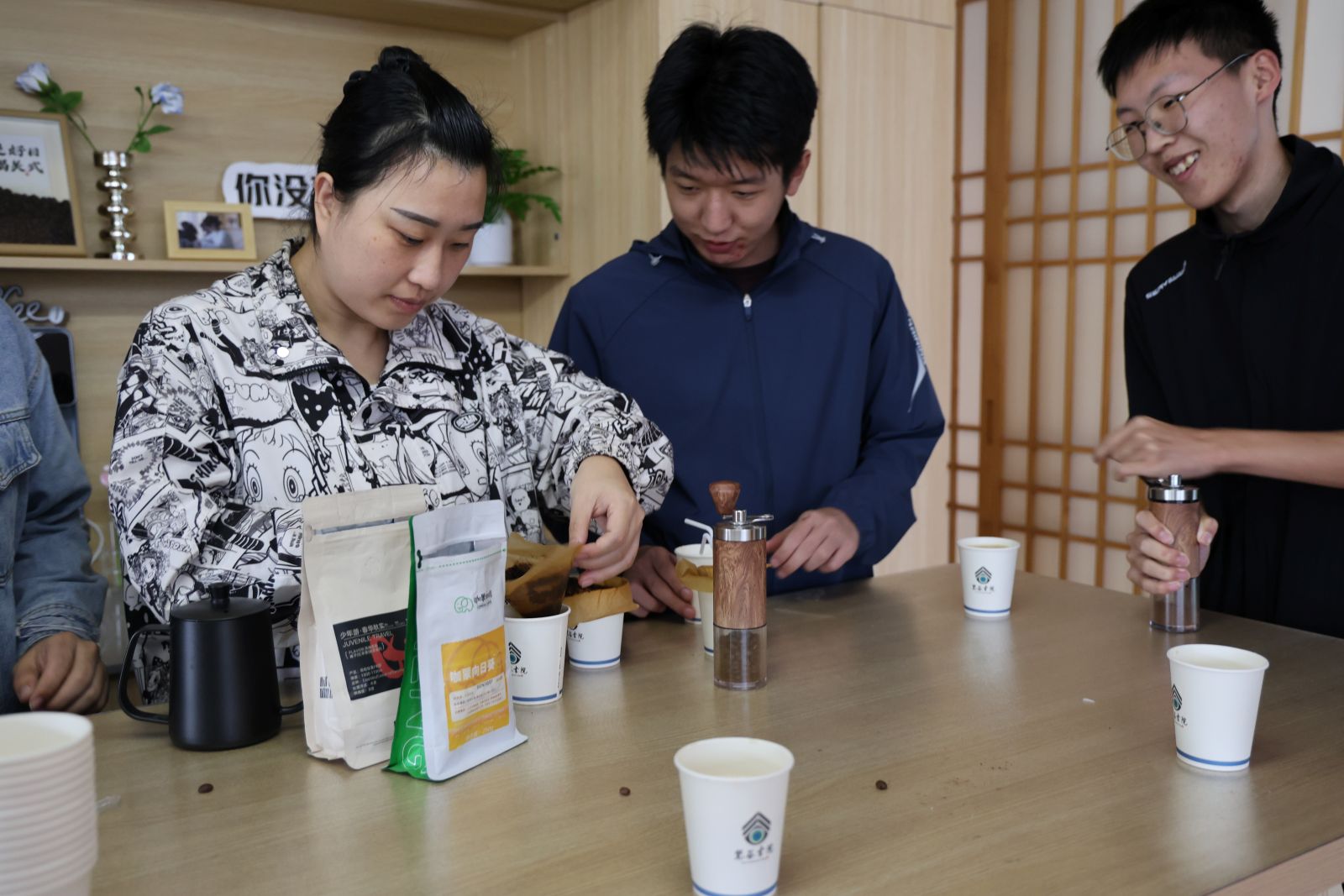 咖啡的香气里,飘着回忆的片段。半杯故事馆里“生活家+1℃社区计划”第14期“月满•焙香话团圆”,贾丽娜、高雅姝、闫述丽三位老师带领15名学生,从磨豆、铺滤纸到热水冲泡,一步步解锁手冲咖啡的乐趣。磨豆机转动的声响里,深褐色的豆粉簌簌落下;热水沿滤杯边缘画圈时,浓郁的焙香渐渐弥漫开来。一边操作,一边分享与咖啡相关的故事:“这焙香让我想起过年时全家围炉煮茶的味道”“我妈总在我回家时冲一杯热咖啡,说能驱散疲惫。当大家捧着热气腾腾的咖啡围坐,醇香绕着笑声,每一口都藏着关于时光与陪伴的故事,让团圆的滋味在舌尖与心间同时绽放。
