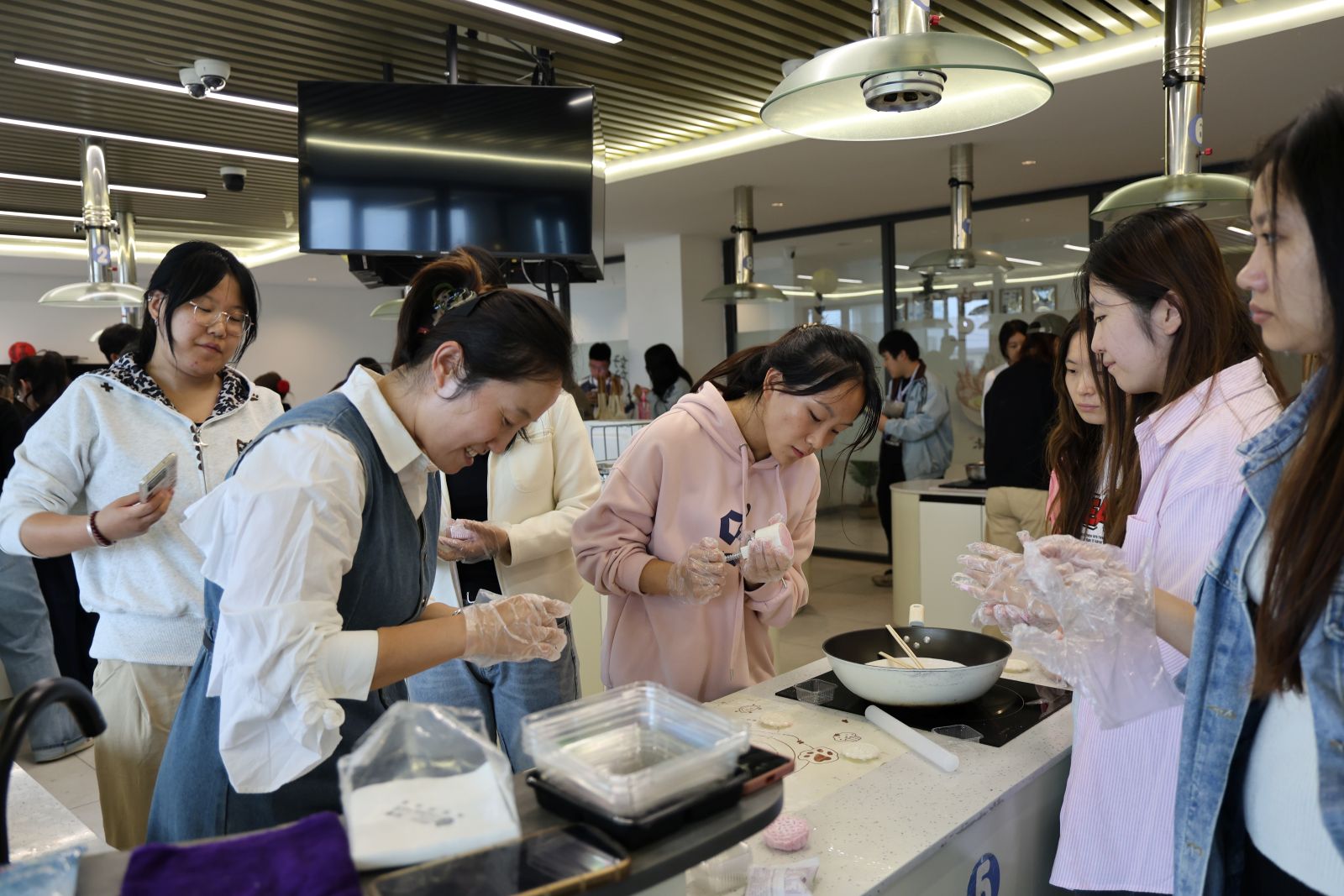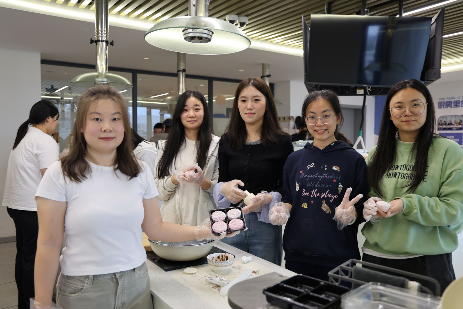 揉进冰皮里的,不只是馅料还有心意。共享厨房里,“月满•烹然心动”冰皮月饼制作活动充满烟火气。杨飞、伦新秀、张珍、邓永强四位老师带领20名 学生,从融化黄油、揉制冰皮到包馅塑形,沉浸式体验月饼制作的乐趣。当一个个圆滚滚、花纹精致的冰皮月饼摆进托盘,大家迫不及待尝了一口,凉丝丝的皮裹着甜沙馅,满口香甜。师生们边吃边分享:“第一次做月饼,虽然不完美,但特别有成就感”“以后中秋节,我也要给家人做冰皮月饼,把今天的快乐分享给他们”。灶火的暖意、月饼的甜味、师生的笑声交织在一起,揉进了这段充满温情的故事里。