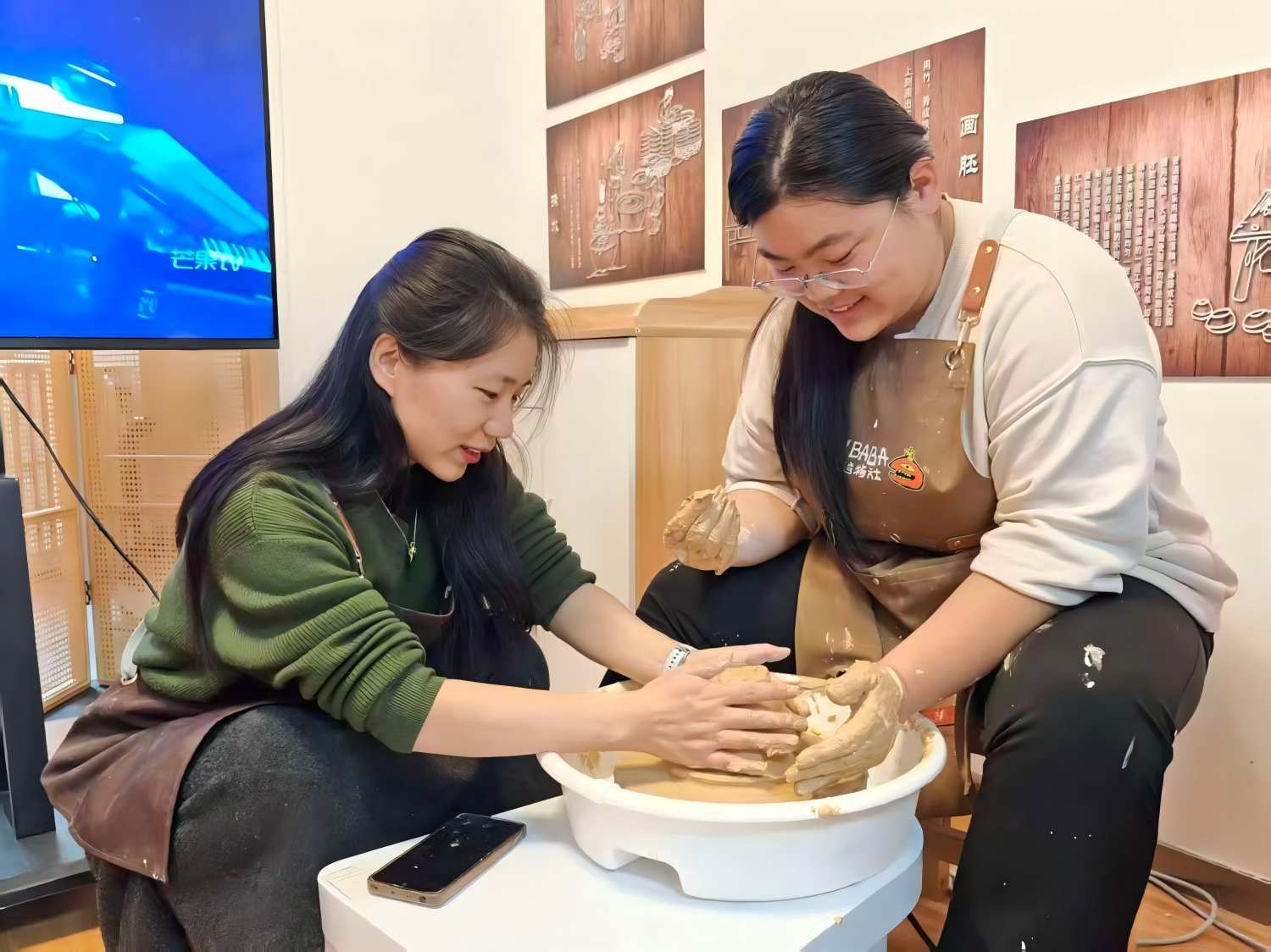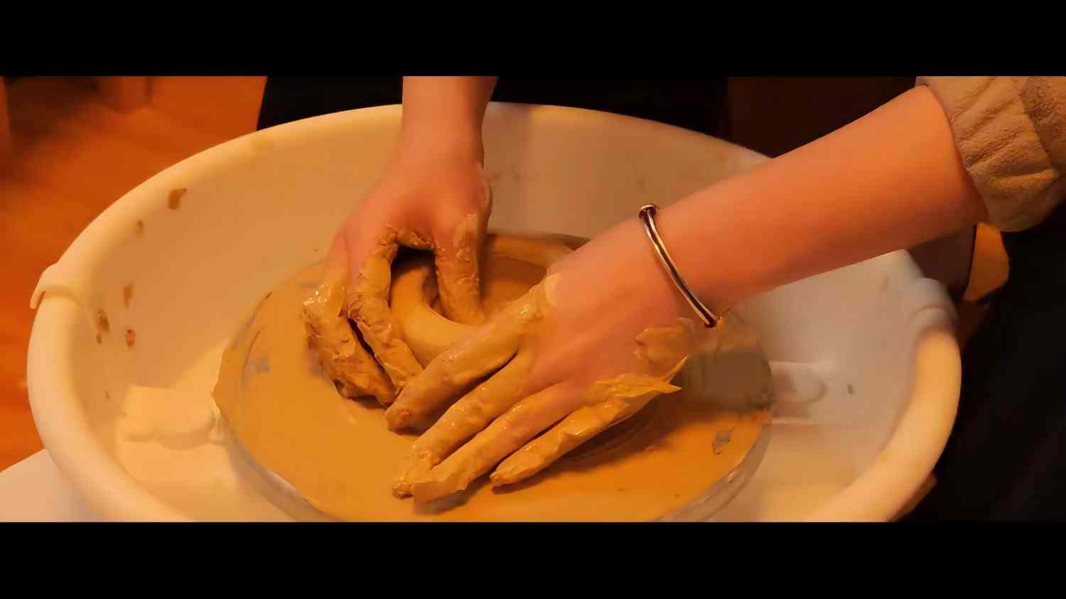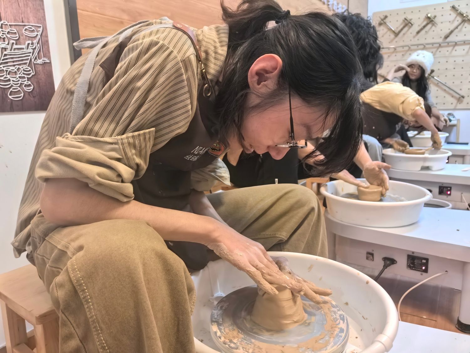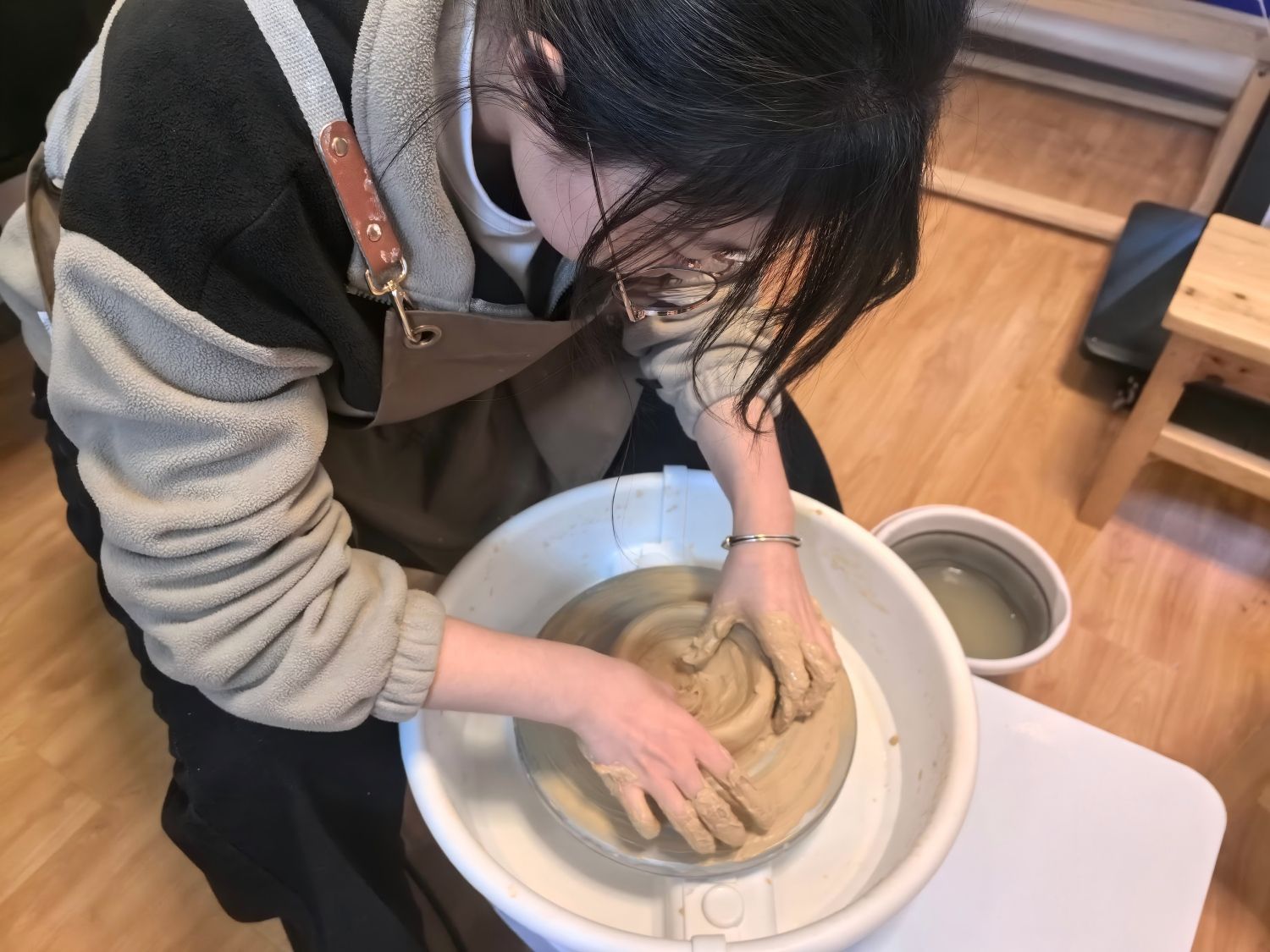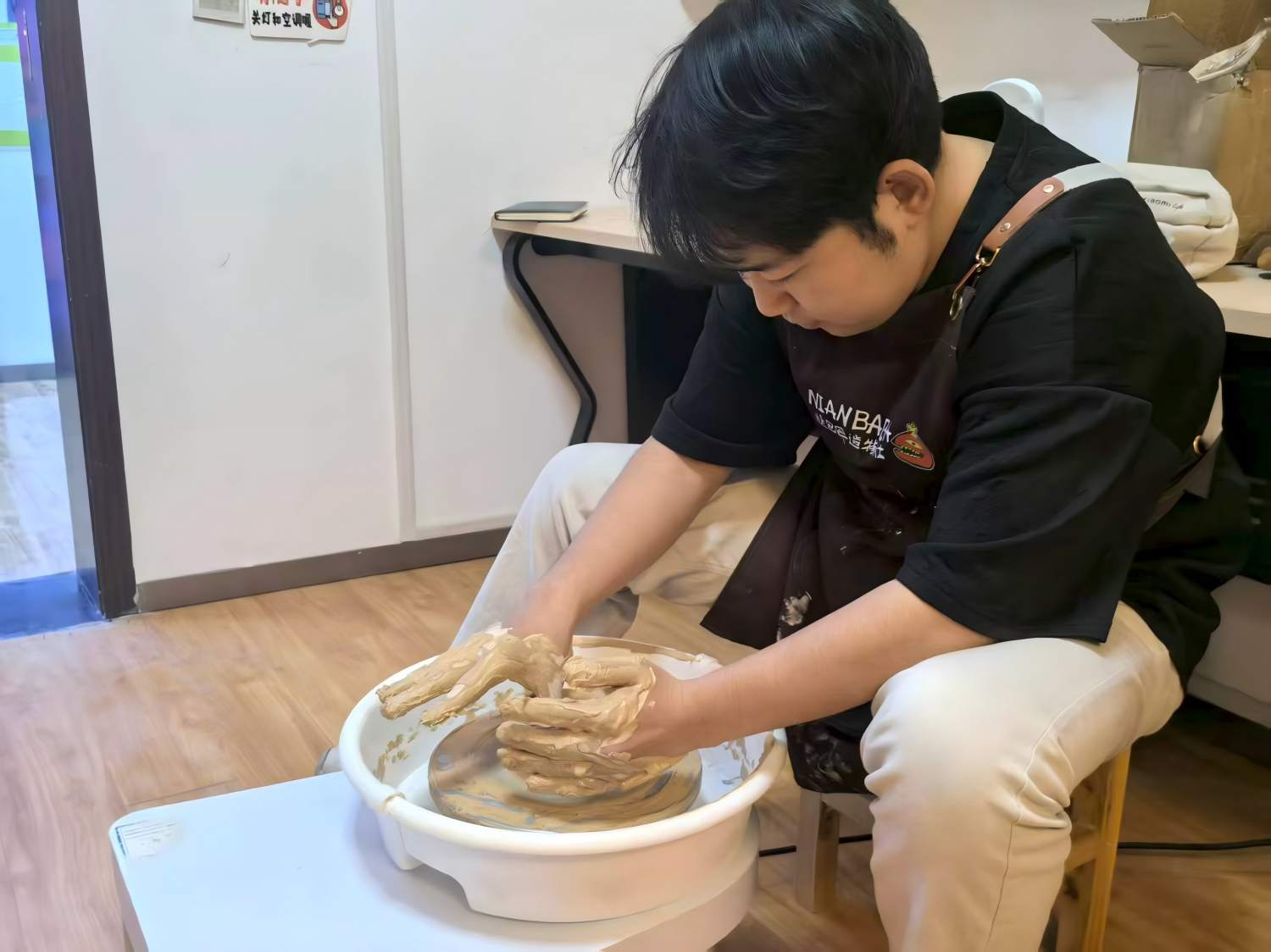 工作坊内,木质长桌上整齐陈列着陶泥、转盘与水钵,空气中弥漫着湿润的泥土清香。韩老师从最基础的“定中心”开始示范,在转盘的旋转中寻找那个微妙的平衡点。“手稳心静”,这四个字成为贯穿整场活动的核心要义。